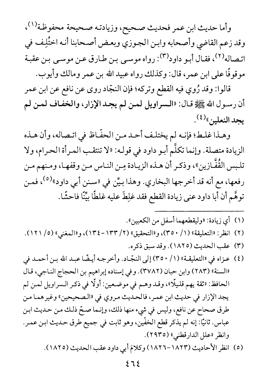 وهذا غلط؛ فإنه لم يختلف أحد من الحفّاظ في اتصاله، وأن هذه الزيادة متصلة. وإنما تكلَّم أبو داود في قوله: «لا تنتقب المرأة الحرام، ولا تلبس القُفَّازين» , وذكر أن هذه الزيادة مِن الناس من وقفها، ومنهم من رفعها، مع أنه قد أخرجها البخاري. وهذا بيِّن في «سنن أبي داود» (¬٥)، فمن توهَّم أن أبا داود عنى زيادة القطع فقد غلِطَ عليه غلطًا بيِّنًا فاحشًا.
