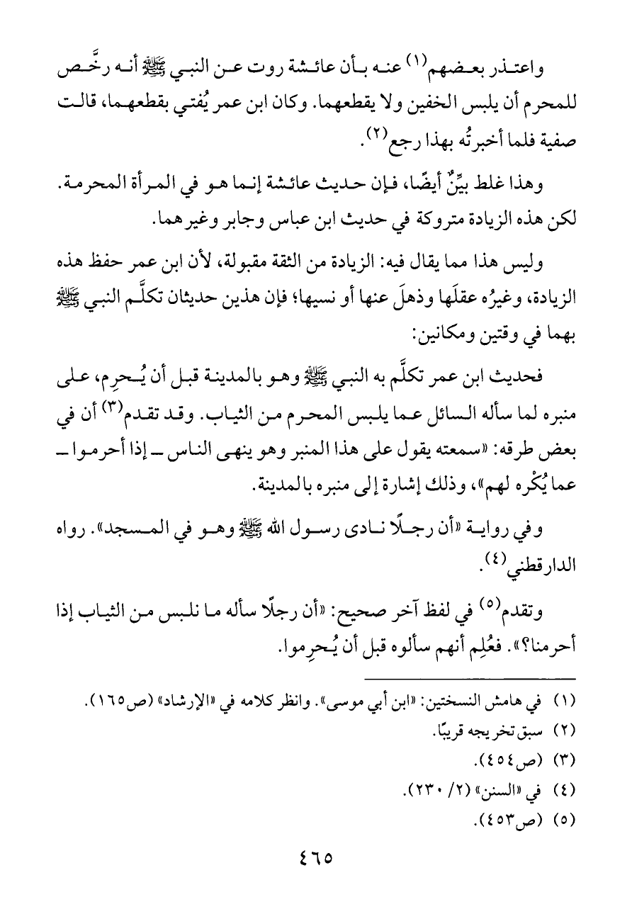 فحديث ابن عمر تكلَّم به النبي - صلى الله عليه وسلم - وهو بالمدينة قبل أن يُحرِم، على منبره لما سأله السائل عما يلبس المحرم من الثياب. وقد تقدم (¬٣) أن في بعض طرقه: «سمعته يقول على هذا المنبر وهو ينهى الناس ــ إذا أحرموا ــ عما يُكْره لهم»، وذلك إشارة إلى منبره بالمدينة.