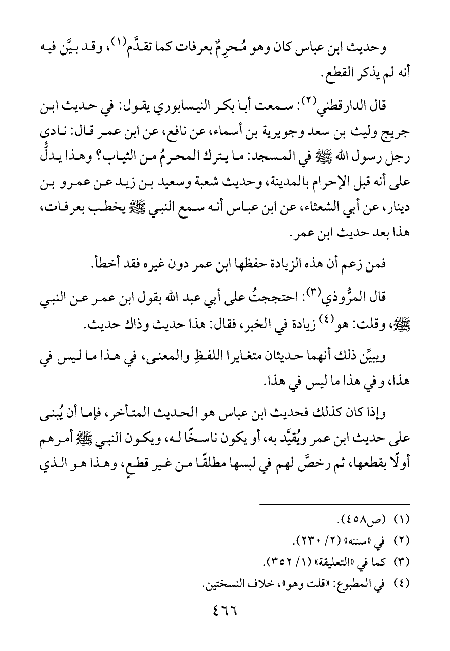 وإذا كان كذلك فحديث ابن عباس هو الحديث المتأخر، فإما أن يُبنى على حديث ابن عمر ويُقيَّد به، أو يكون ناسخًا له، ويكون النبي - صلى الله عليه وسلم - أمرهم أولًا بقطعها، ثم رخصَّ لهم في لبسها مطلقًا من غير قطعٍ، وهذا هو الذي