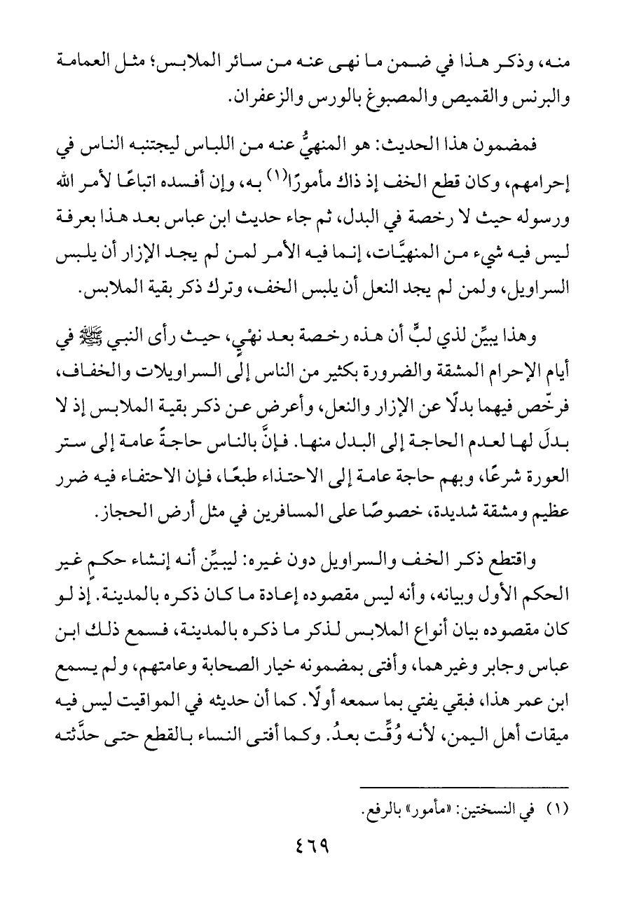وهذا يبيِّن لذي لبٍّ أن هذه رخصة بعد نهْيٍ، حيث رأى النبي - صلى الله عليه وسلم - في أيام الإحرام المشقة والضرورة بكثير من الناس إلى السراويلات والخفاف، فرخّص فيهما بدلًا عن الإزار والنعل، وأعرض عن ذكر بقية الملابس إذ لا بدلَ لها لعدم الحاجة إلى البدل منها. فإنَّ بالناس حاجةً عامة إلى ستر العورة شرعًا، وبهم حاجة عامة إلى الاحتذاء طبعًا، فإن الاحتفاء فيه ضرر عظيم ومشقة شديدة، خصوصًا على المسافرين في مثل أرض الحجاز.