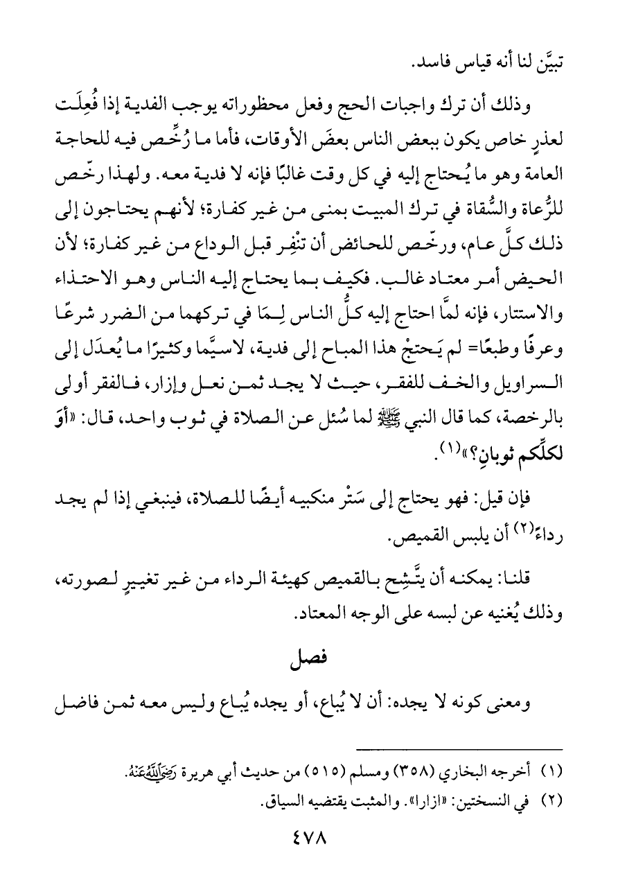 وذلك أن ترك واجبات الحج وفعل محظوراته يوجب الفدية إذا فُعِلَت لعذرٍ خاص يكون ببعض الناس بعضَ الأوقات، فأما ما رُخِّص فيه للحاجة العامة وهو ما يُحتاج إليه في كل وقت غالبًا فإنه لا فدية معه. ولهذا رخّص للرُّعاة والسُّقاة في ترك المبيت بمنى من غير كفارة؛ لأنهم يحتاجون إلى ذلك كلَّ عام، ورخّص للحائض أن تنْفِر قبل الوداع من غير كفارة؛ لأن الحيض أمر معتاد غالب. فكيف بما يحتاج إليه الناس وهو الاحتذاء والاستتار، فإنه لمَّا احتاج إليه كلُّ الناس لِمَا في تركهما من الضرر شرعًا وعرفًا وطبعًا= لم يَحتجْ هذا المباح إلى فدية، لاسيَّما وكثيرًا ما يُعدَل إلى السراويل والخف للفقر، حيث لا يجد ثمن نعل وإزار، فالفقر أولى بالرخصة، كما قال النبي - صلى الله عليه وسلم - لما سُئل عن الصلاة في ثوب واحد، قال: «أوَ لكلِّكم ثوبانِ؟» (¬١).