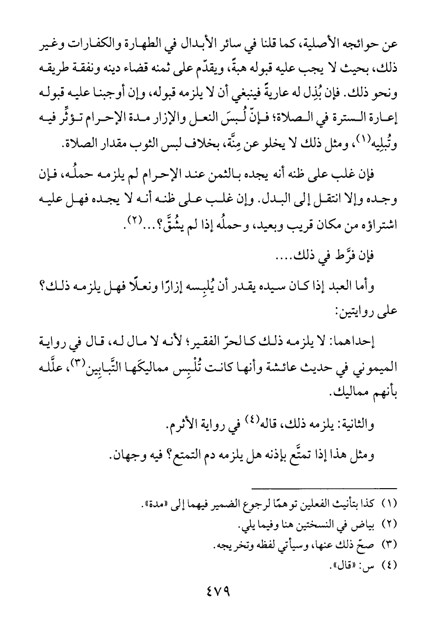 عن حوائجه الأصلية، كما قلنا في سائر الأبدال في الطهارة والكفارات وغير ذلك، بحيث لا يجب عليه قبوله هبةً، ويقدّم على ثمنه قضاء دينه ونفقة طريقه ونحو ذلك. فإن بُذِل له عاريةً فينبغي أن لا يلزمه قبوله، وإن أوجبنا عليه قبوله إعارة السترة في الصلاة؛ فإنّ لُبسَ النعل والإزار مدة الإحرام تؤثِّر فيه وتُبلِيه (¬١)، ومثل ذلك لا يخلو عن مِنَّة، بخلاف لبس الثوب مقدار الصلاة.