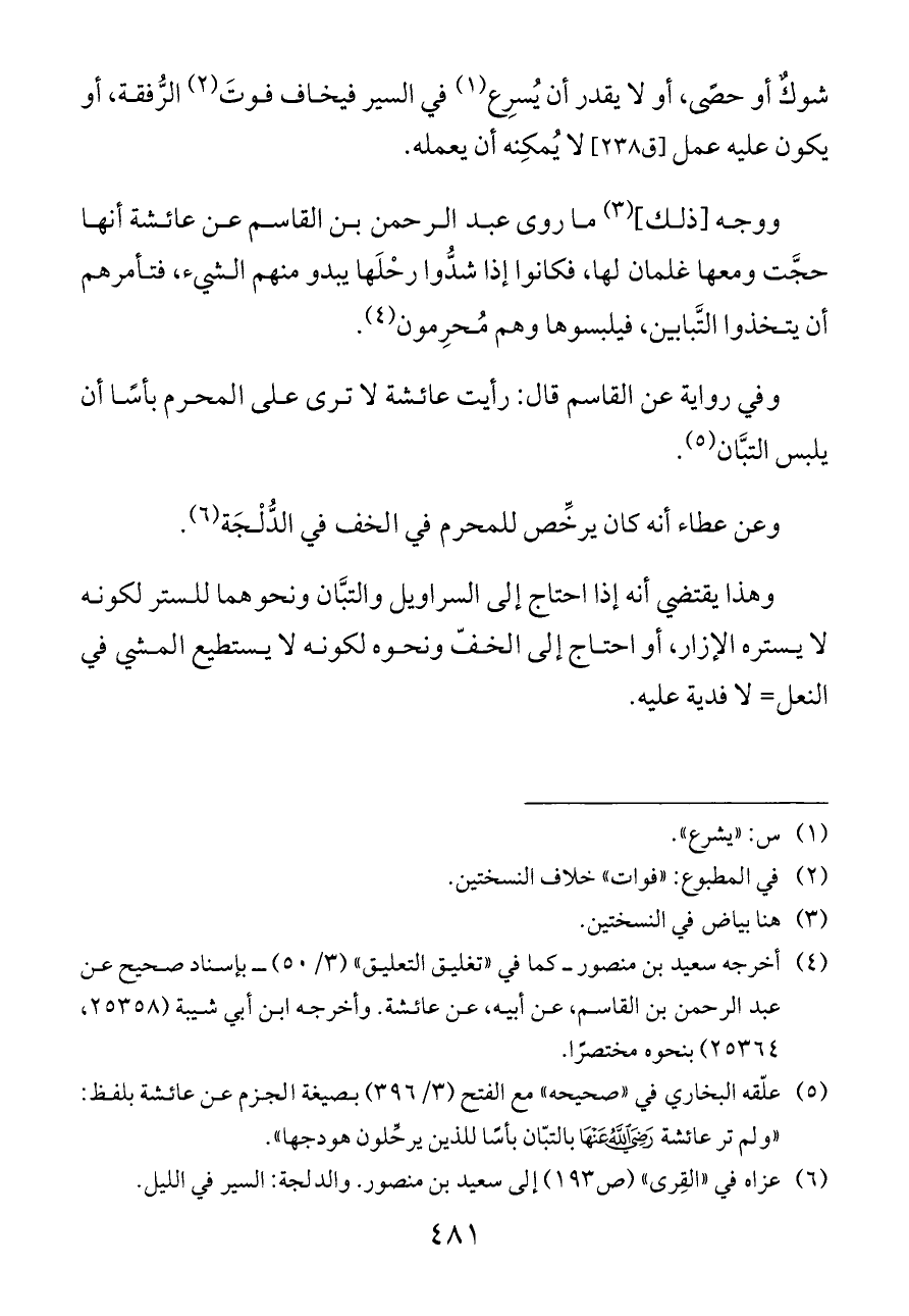 (¬٥) علّقه البخاري في «صحيحه» مع الفتح (٣/ ٣٩٦) بصيغة الجزم عن عائشة بلفظ: «ولم تر عائشة - رضي الله عنها - بالتبّان بأسًا للذين يرحِّلون هودجها».