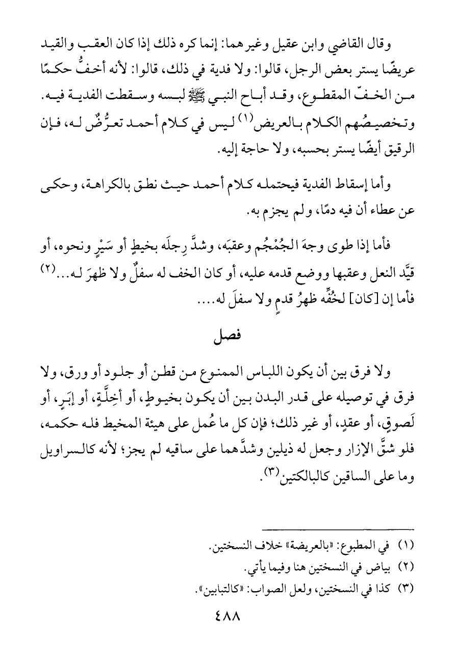 وقال القاضي وابن عقيل وغيرهما: إنما كره ذلك إذا كان العقب والقيد عريضًا يستر بعض الرجل، قالوا: ولا فدية في ذلك، قالوا: لأنه أخفُّ حكمًا من الخفّ المقطوع، وقد أباح النبي - صلى الله عليه وسلم - لبسه وسقطت الفدية فيه. وتخصيصُهم الكلام بالعريض (¬١) ليس في كلام أحمد تعرُّضٌ له، فإن الرقيق أيضًا يستر بحسبه، ولا حاجة إليه.