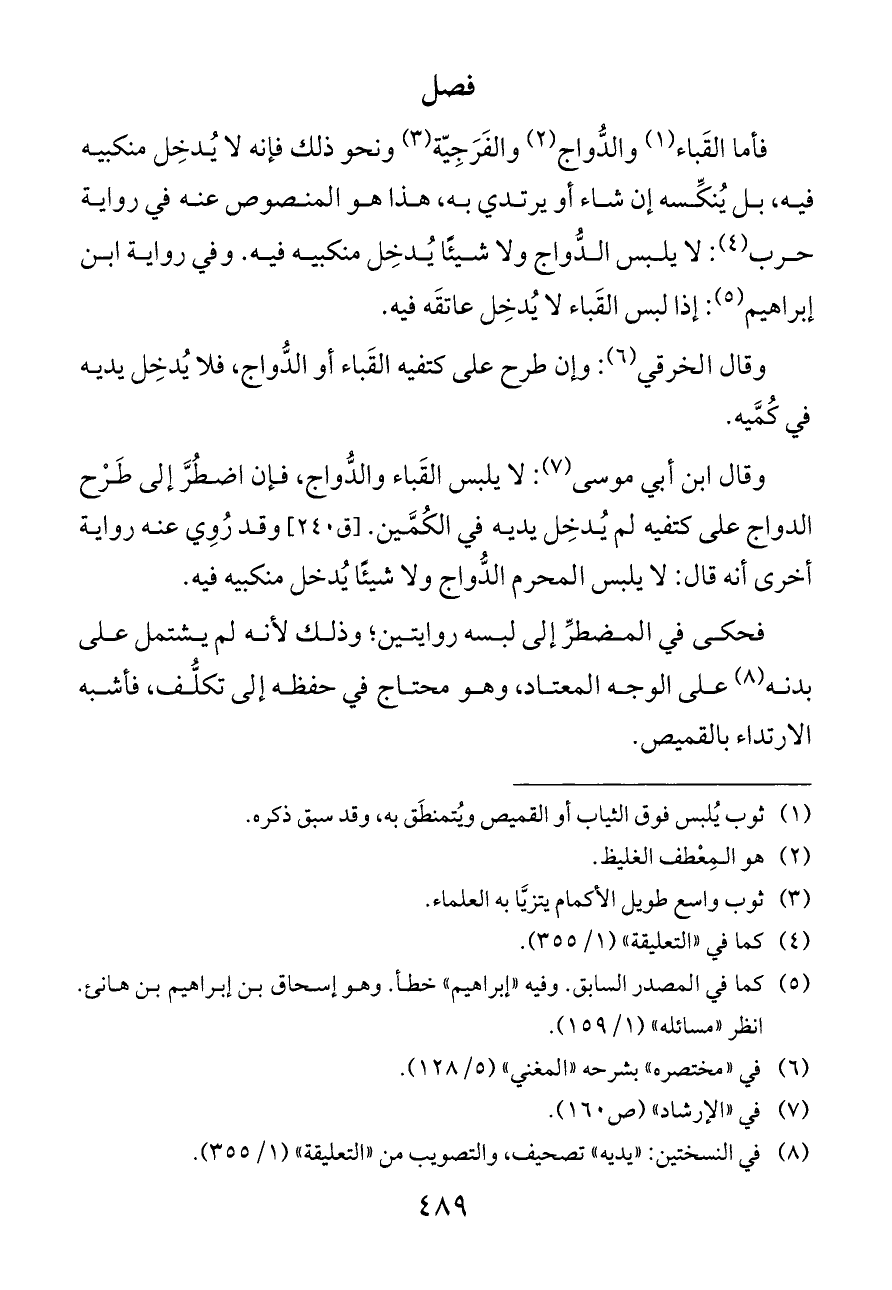 فأما القَباء (¬١) والدُّواج (¬٢) والفَرَجِيّة (¬٣) ونحو ذلك فإنه لا يُدخِل منكبيه فيه، بل يُنكِّسه إن شاء أو يرتدي به، هذا هو المنصوص عنه في رواية حرب (¬٤): لا يلبس الدُّواج ولا شيئًا يُدخِل منكبيه فيه. وفي رواية ابن إبراهيم (¬٥): إذا لبس القَباء لا يُدخِل عاتقَه فيه.