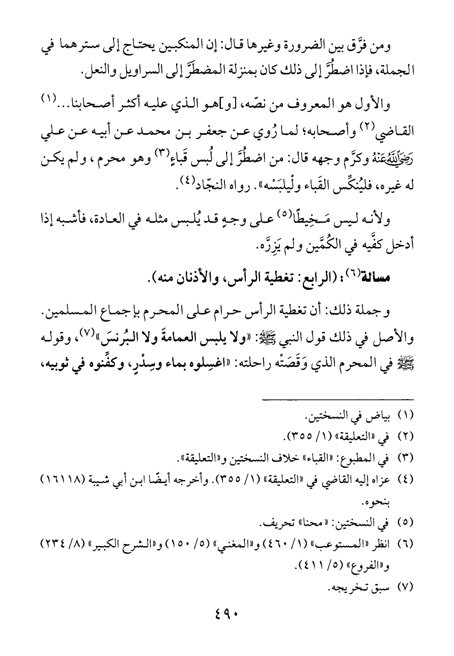 والأول هو المعروف من نصّه، [و] هو الذي عليه أكثر أصحابنا ... (¬١) القاضي (¬٢) وأصحابه؛ لما رُوي عن جعفر بن محمد عن أبيه عن علي - رضي الله عنه - وكرَّم وجهه قال: من اضطُرَّ إلى لُبس قَباءٍ (¬٣) وهو محرم، ولم يكن له غيره، فليُنكِّس القَباء ولْيلبَسْه». رواه النجّاد (¬٤).