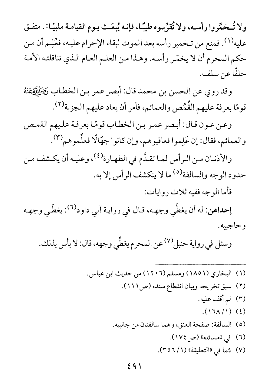 ولا تُخمِّروا رأسه، ولا تُقرِّبوه طيبًا، فإنه يُبعَث يوم القيامة ملبيًا». متفق عليه (¬١). فمنع من تخمير رأسه بعد الموت لبقاء الإحرام عليه، فعُلِم أن من حكم المحرم أن لا يخمّر رأسه. وهذا من العلم العام الذي تناقلته الأمة خلفًا عن سلف.