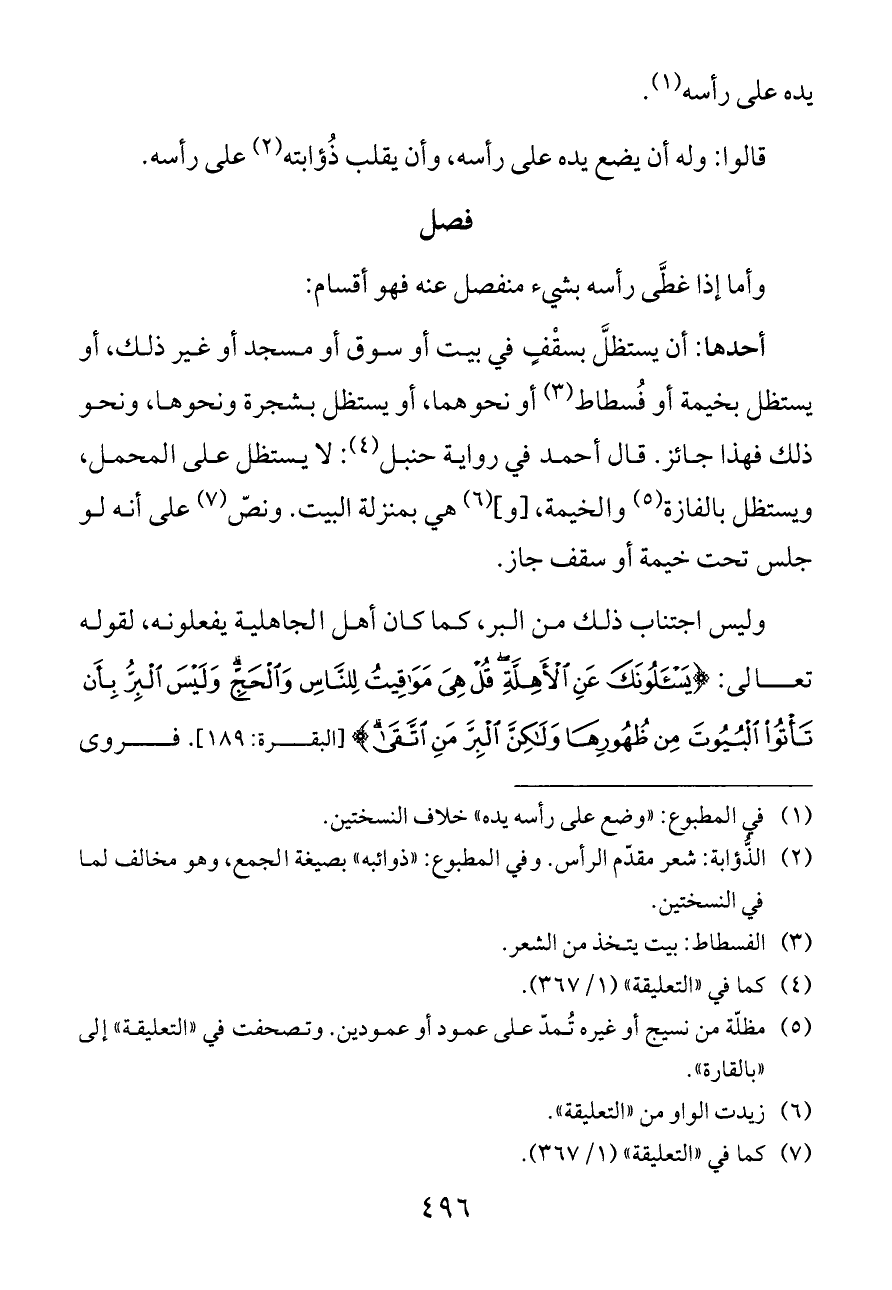 أحدها: أن يستظلَّ بسقْفٍ في بيت أو سوق أو مسجد أو غير ذلك، أو يستظل بخيمة أو فُسطاط (¬٣) أو نحوهما، أو يستظل بشجرة ونحوها، ونحو ذلك فهذا جائز. قال أحمد في رواية حنبل (¬٤): لا يستظل على المحمل، ويستظل بالفازة (¬٥) والخيمة، [و] (¬٦) هي بمنزلة البيت. ونصّ (¬٧) على أنه لو جلس تحت خيمة أو سقف جاز.