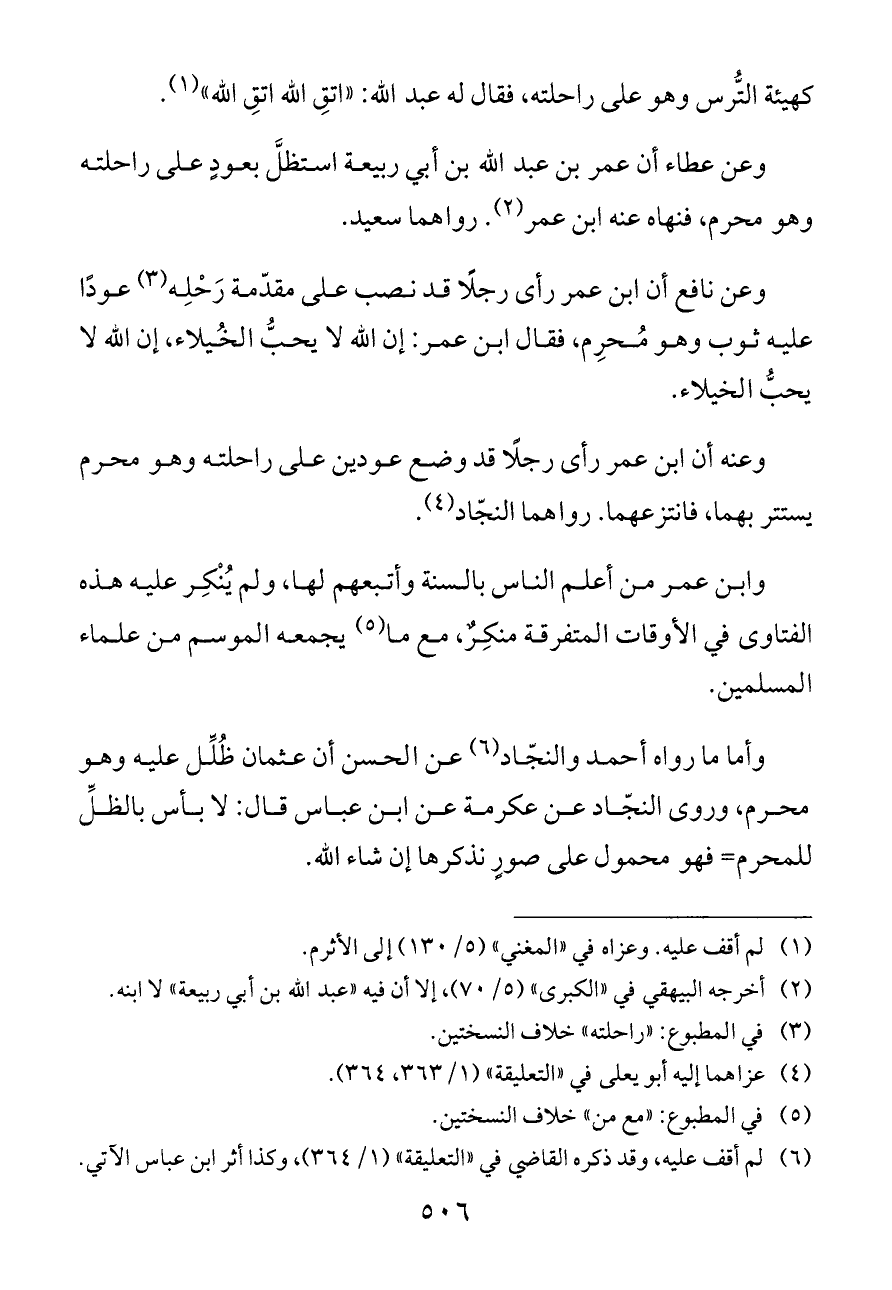 وعن نافع أن ابن عمر رأى رجلًا قد نصب على مقدّمة رَحْلِه (¬٣) عودًا عليه ثوب وهو مُحرِم، فقال ابن عمر: إن الله لا يحبُّ الخُيلاء، إن الله لا يحبُّ الخيلاء.