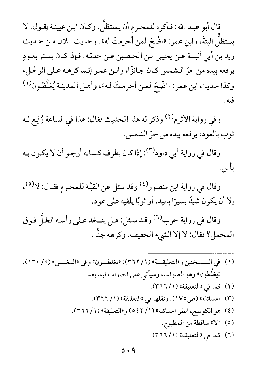 قال أبو عبد الله: فأكره للمحرم أن يستظلَّ. وكان ابن عيينة يقول: لا يستظلُّ البتةَ، وابن عمر: «اضْحَ لمن أحرمتَ له». وحديث بلال من حديث زيد بن أبي أنيسة عن يحيى بن الحصين عن جدته. فإذا كان يستر بعودٍ يرفعه بيده من حرّ الشمس كان جائزًا، وابن عمر إنما كرهه على الرحْل، وكذا حديث ابن عمر: «اضْحَ لمن أحرمتَ له»، وأهل المدينة يُغلِّظون (¬١) فيه.