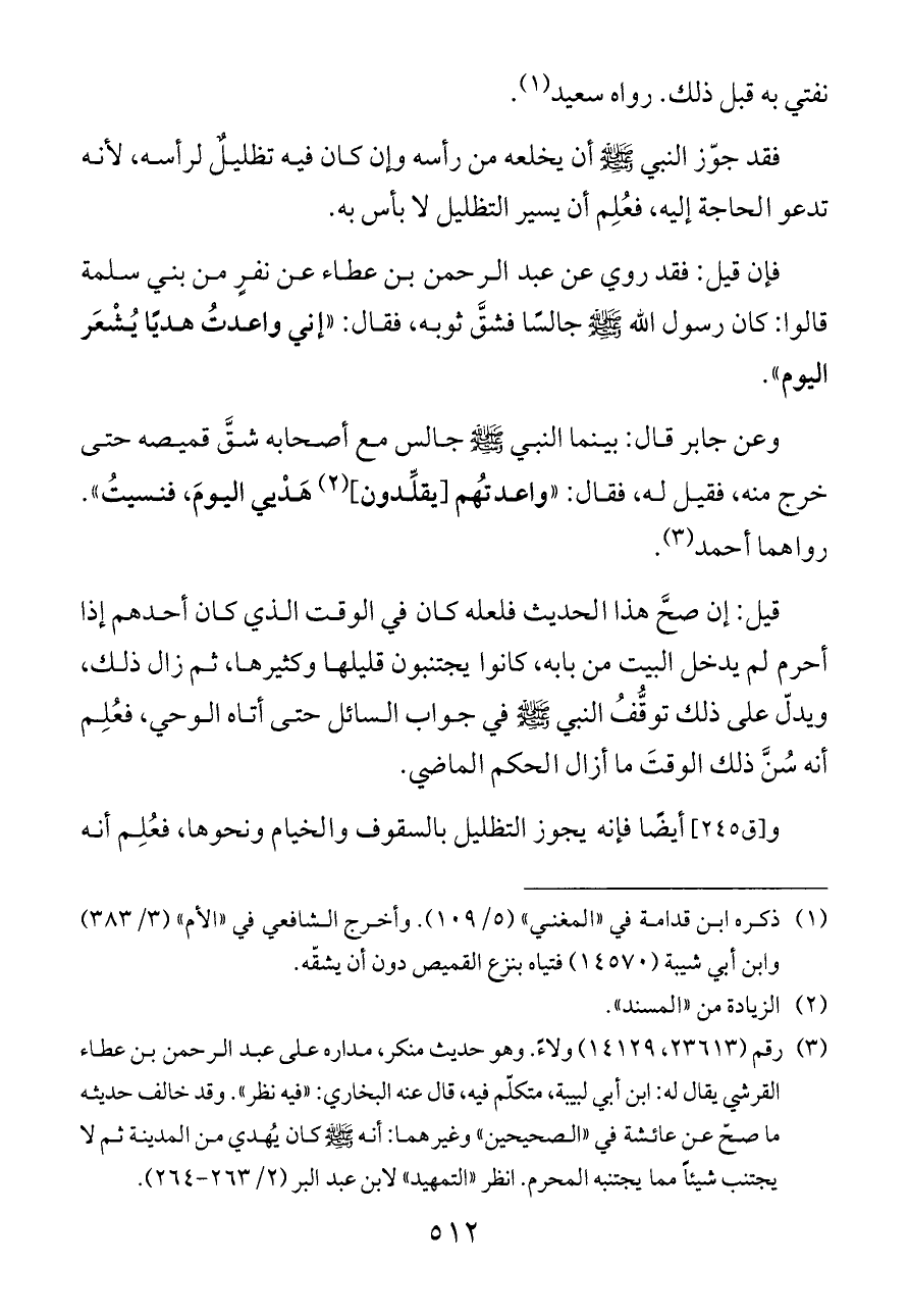 و [ق ٢٤٥] أيضًا فإنه يجوز التظليل بالسقوف والخيام ونحوها، فعُلِم أنه