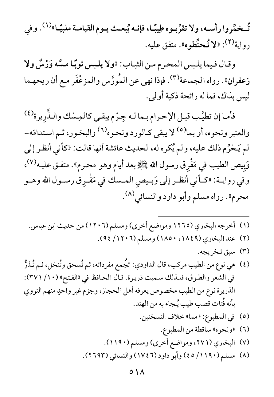 فأما إن تطيَّب قبل الإحرام بما له جِرْم يبقى كالمِسْك والذَّرِيرة (¬٤) والعنبر ونحوه، أو بما (¬٥) لا يبقى كالورد ونحوه (¬٦) والبخور، ثم استدامَه= لم يَحْرُم ذلك عليه، ولم يُكره له، لحديث عائشة أنها قالت: «كأني أنظر إلى وَبِيص الطيب في مَفْرِق رسول الله - صلى الله عليه وسلم - بعد أيام وهو محرم». متفق عليه (¬٧)، وفي رواية: «كأني أنظر إلى وَبيصِ المسك في مَفْرِق رسول الله وهو محرم». رواه مسلم وأبو داود والنسائي (¬٨).