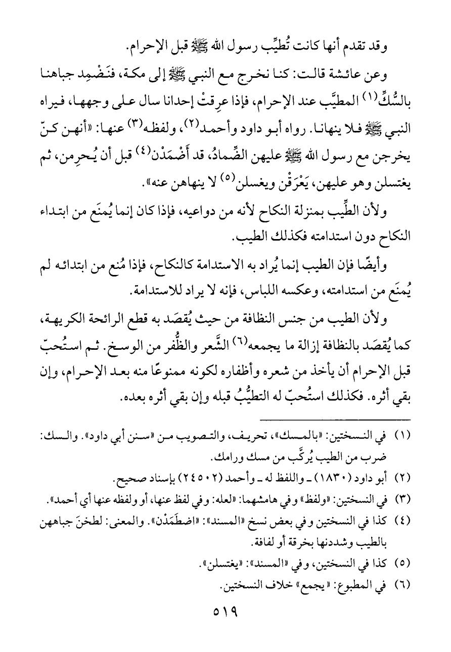 وعن عائشة قالت: كنا نخرج مع النبي - صلى الله عليه وسلم - إلى مكة، فنَضْمِد جباهنا بالسُّكِّ (¬١) المطيَّب عند الإحرام، فإذا عرِقتْ إحدانا سال على وجهها، فيراه النبي - صلى الله عليه وسلم - فلا ينهانا. رواه أبو داود وأحمد (¬٢)، ولفظه (¬٣) عنها: «أنهن كنّ يخرجن مع رسول الله - صلى الله عليه وسلم - عليهن الضِّمادُ، قد أَضْمَدْن (¬٤) قبل أن يُحرِمن، ثم يغتسلن وهو عليهن، يَعْرَقْن ويغسلن (¬٥) لا ينهاهن عنه».