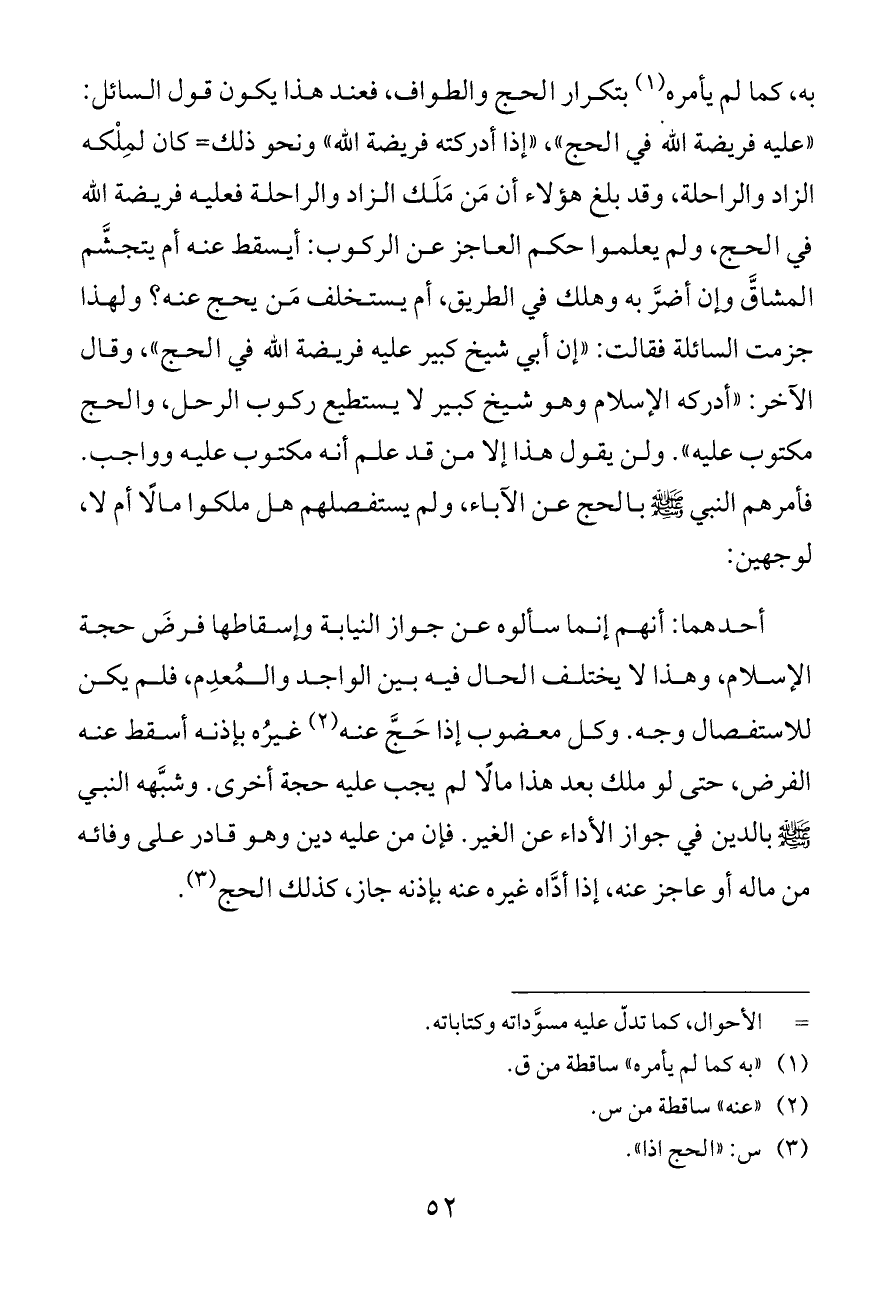أحدهما: أنهم إنما سألوه عن جواز النيابة وإسقاطها فرضَ حجة الإسلام، وهذا لا يختلف الحال فيه بين الواجد والمُعدِم، فلم يكن للاستفصال وجه. وكل معضوب إذا حَجَّ عنه (¬٢) غيرُه بإذنه أسقط عنه الفرض، حتى لو ملك بعد هذا مالًا لم يجب عليه حجة أخرى. وشبَّهه النبي - صلى الله عليه وسلم - بالدين في جواز الأداء عن الغير. فإن من عليه دين وهو قادر على وفائه من ماله أو عاجز عنه، إذا أدَّاه غيره عنه بإذنه جاز، كذلك الحج (¬٣).