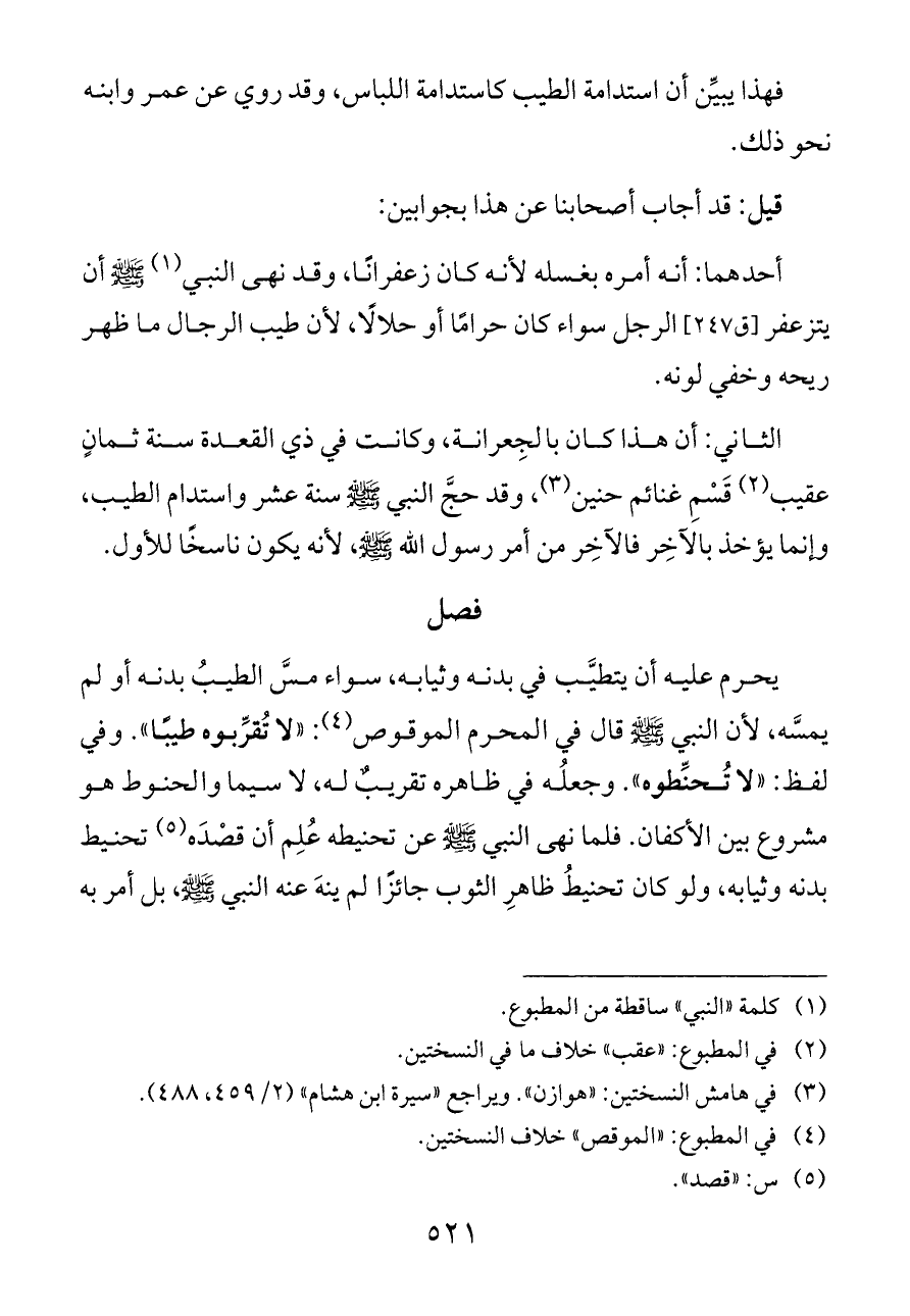 الثاني: أن هذا كان بالجِعرانة، وكانت في ذي القعدة سنة ثمانٍ عقيب (¬٢) قَسْمِ غنائم حنين (¬٣)، وقد حجَّ النبي - صلى الله عليه وسلم - سنة عشر واستدام الطيب، وإنما يؤخذ بالآخِر فالآخِر من أمر رسول الله - صلى الله عليه وسلم -، لأنه يكون ناسخًا للأول.