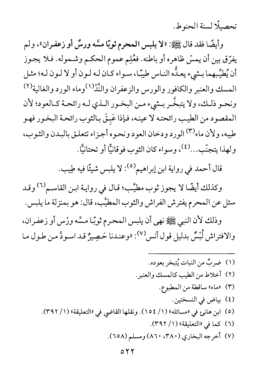 وذلك لأن النبي - صلى الله عليه وسلم - نهى أن يلبس المحرم ثوبًا مسَّه ورْس أو زعفران، والافتراش لُبْسٌ بدليل قول أنس (¬٧): «وعندنا حَصِيرٌ قد اسودَّ من طول ما