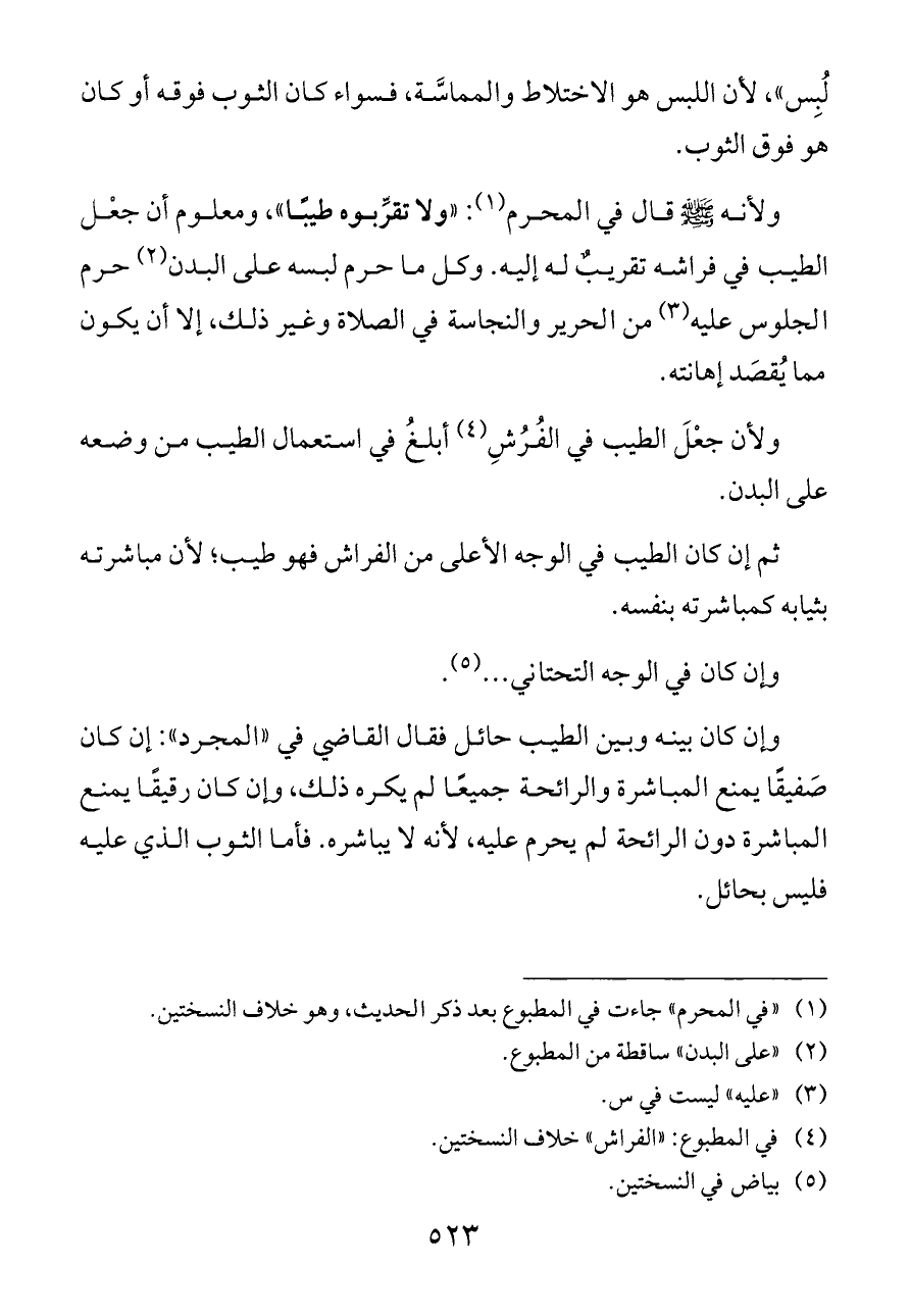 ولأنه - صلى الله عليه وسلم - قال في المحرم (¬١): «ولا تقرِّبوه طيبًا»، ومعلوم أن جعْل الطيب في فراشه تقريبٌ له إليه. وكل ما حرم لبسه على البدن (¬٢) حرم الجلوس عليه (¬٣) من الحرير والنجاسة في الصلاة وغير ذلك، إلا أن يكون مما يُقصَد إهانته.