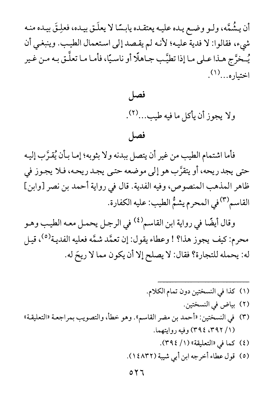 فأما اشتمام الطيب من غير أن يتصل ببدنه ولا بثوبه؛ إما بأن يُقرَّب إليه حتى يجد ريحه، أو يتقرَّب هو إلى موضعه حتى يجد ريحه، فلا يجوز في ظاهر المذهب المنصوص، وفيه الفدية. قال في رواية أحمد بن نصر [وابن] القاسم (¬٣) في المحرم يشمُّ الطيب: عليه الكفارة.