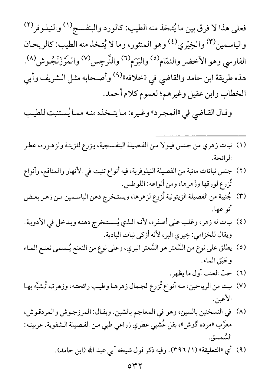 فعلى هذا لا فرق بين ما يُتخذ منه الطيب: كالورد والبنفسج (¬١) والنيلوفر (¬٢) والياسمين (¬٣) والخِيْري (¬٤) وهو المنثور، وما لا يُتخذ منه الطيب: كالريحان الفارسي وهو الأخضر والنمّام (¬٥) والبَرَم (¬٦) والنَّرجِس (¬٧) والمَرْزَنْجُوش (¬٨). هذه طريقة ابن حامد والقاضي في «خلافه» (¬٩) وأصحابه مثل الشريف وأبي الخطاب وابن عقيل وغيرهم؛ لعموم كلام أحمد.