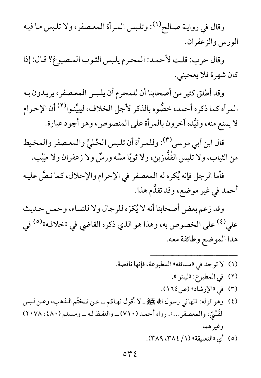 وقد أطلق كثير من أصحابنا أن للمحرم أن يلبس المعصفر، يريدون به المرأة كما ذكره أحمد، خصُّوه بالذكر لأجل الخلاف، ليبيِّنوا (¬٢) أن الإحرام لا يمنع منه، وقيَّده آخرون بالمرأة على المنصوص، وهو أجود عبارة.