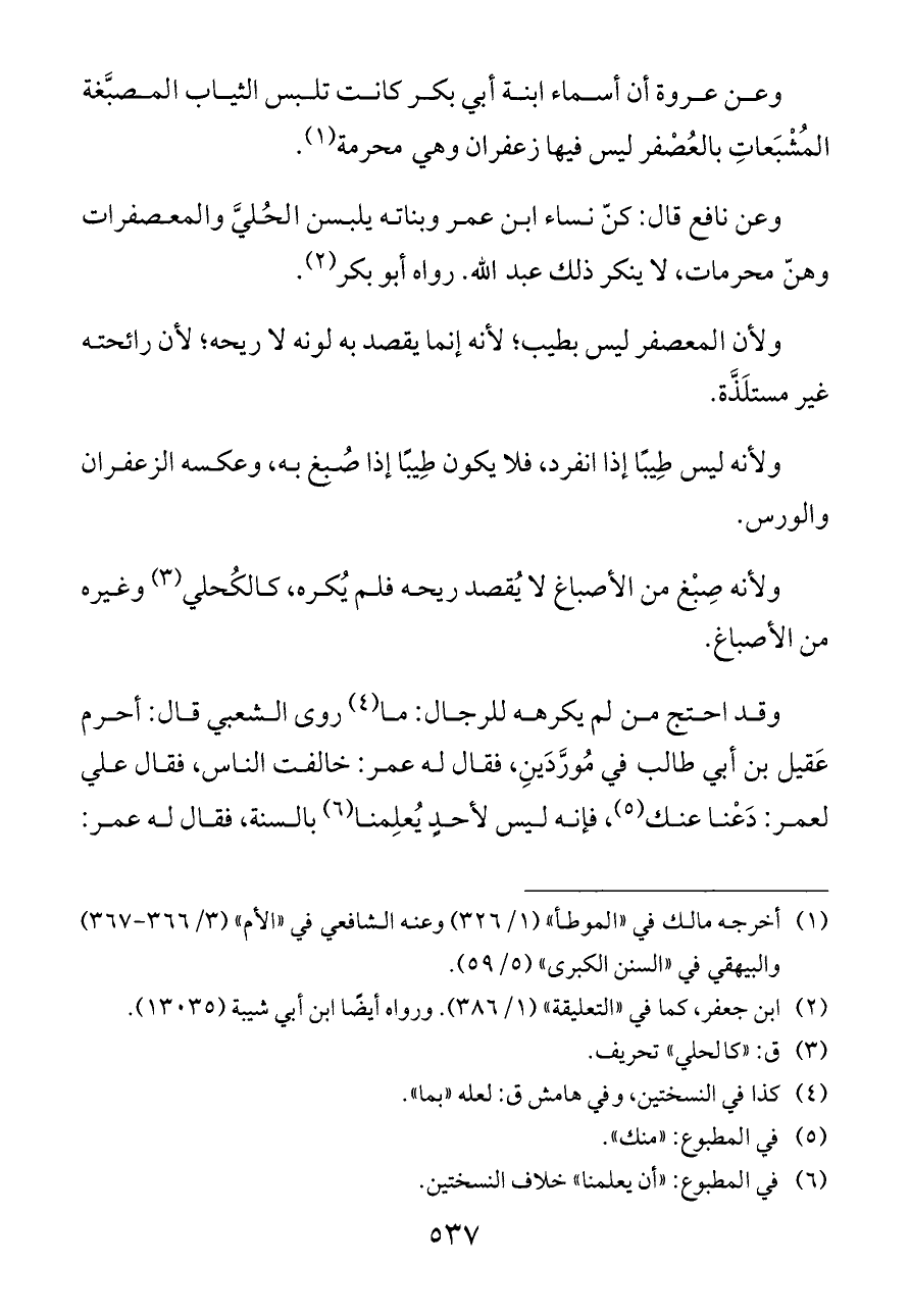 وعن نافع قال: كنّ نساء ابن عمر وبناته يلبسن الحُليَّ والمعصفرات وهنّ محرمات، لا ينكر ذلك عبد الله. رواه أبو بكر (¬٢).