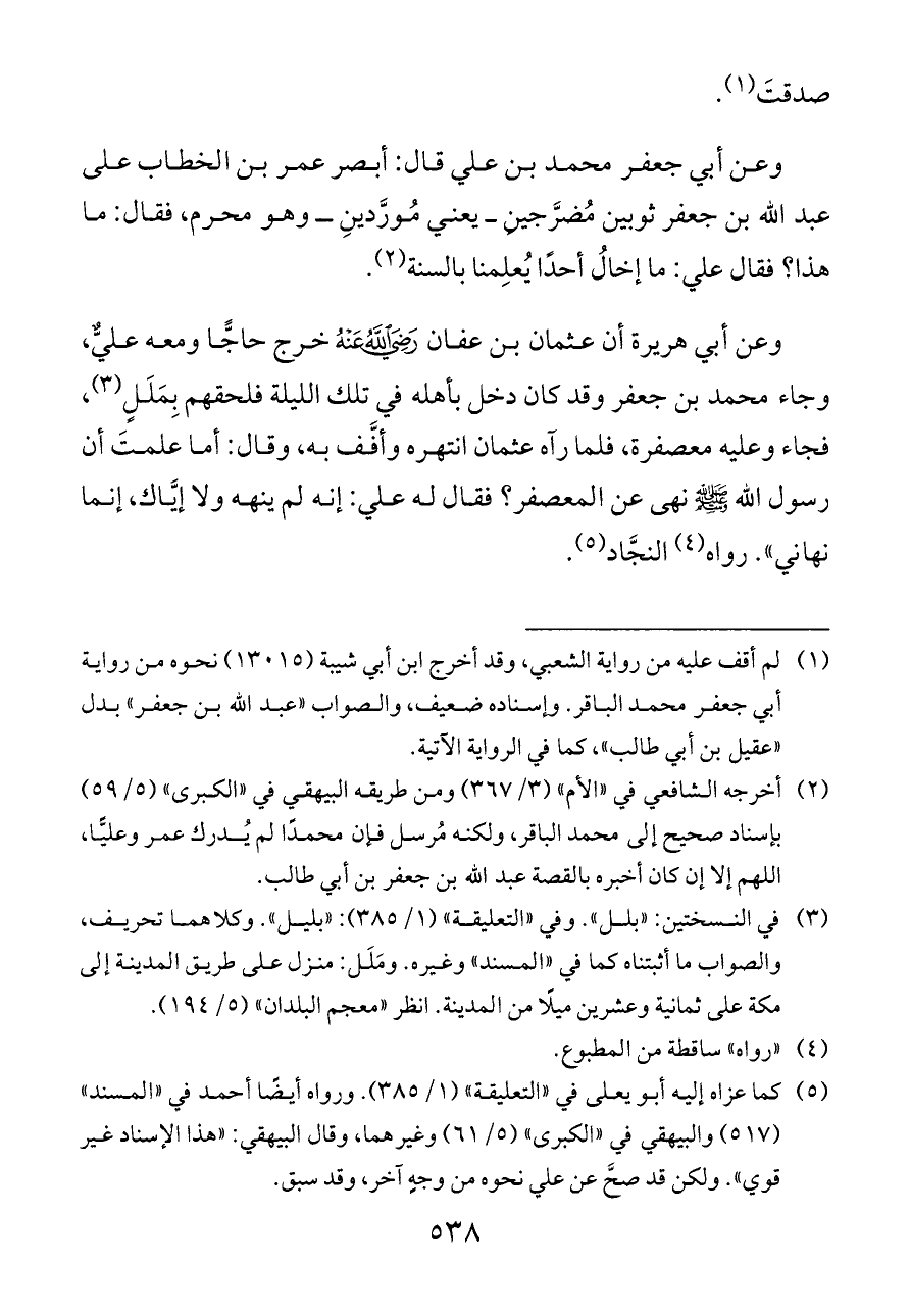 وعن أبي جعفر محمد بن علي قال: أبصر عمر بن الخطاب على عبد الله بن جعفر ثوبين مُضرَّجينِ ــ يعني مُورَّدينِ ــ وهو محرم، فقال: ما هذا؟ فقال علي: ما إخالُ أحدًا يُعلِمنا بالسنة (¬٢).