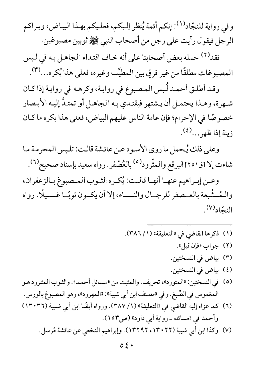 وقد أطلق أحمد لُبس المصبوغ في رواية، وكرهه في رواية إذا كان شهرة، وهذا يحتمل أن يشتهر فيقتدي به الجاهل أو تمتدَّ إليه الأبصار خصوصًا في الإحرام؛ فإن عامة الناس عليهم البياض، فعلى هذا يكره ما كان زينة إذا ظهر ... (¬٤).