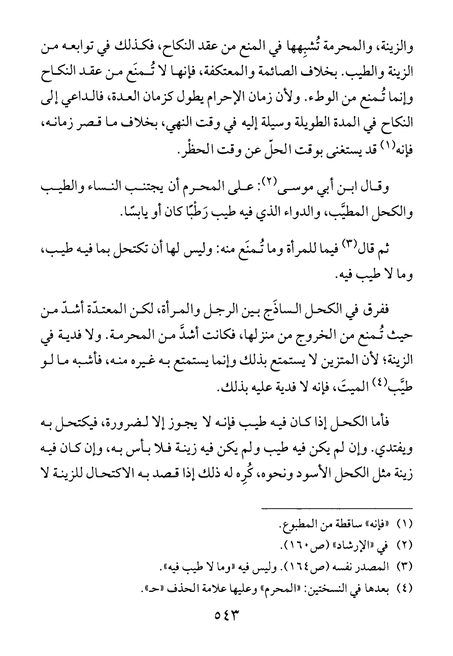 فأما الكحل إذا كان فيه طيب فإنه لا يجوز إلا لضرورة، فيكتحل به ويفتدي. وإن لم يكن فيه طيب ولم يكن فيه زينة فلا بأس به، وإن كان فيه زينة مثل الكحل الأسود ونحوه، كُرِه له ذلك إذا قصد به الاكتحال للزينة لا