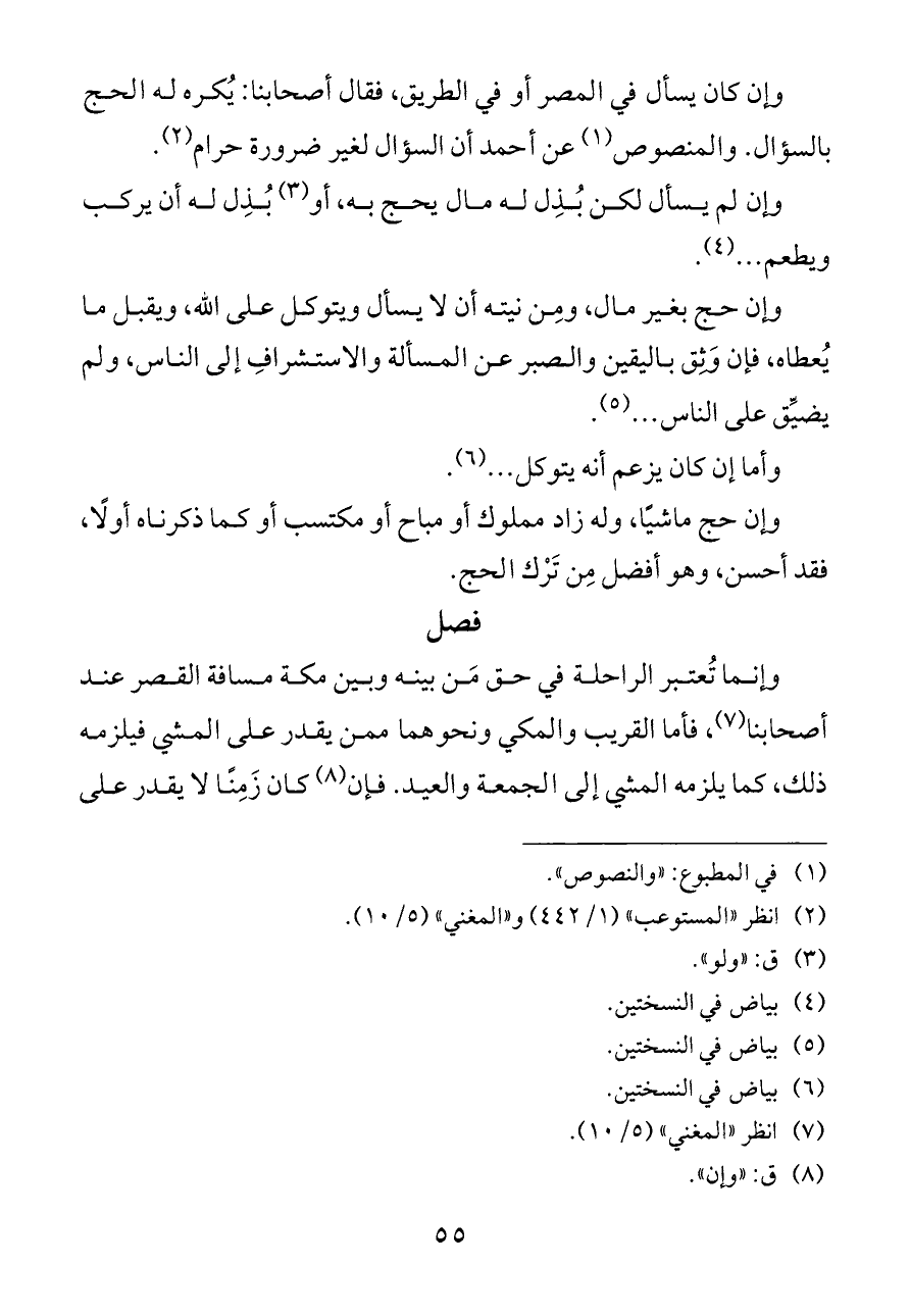 وإن كان يسأل في المصر أو في الطريق، فقال أصحابنا: يُكره له الحج بالسؤال. والمنصوص (¬١) عن أحمد أن السؤال لغير ضرورة حرام (¬٢).