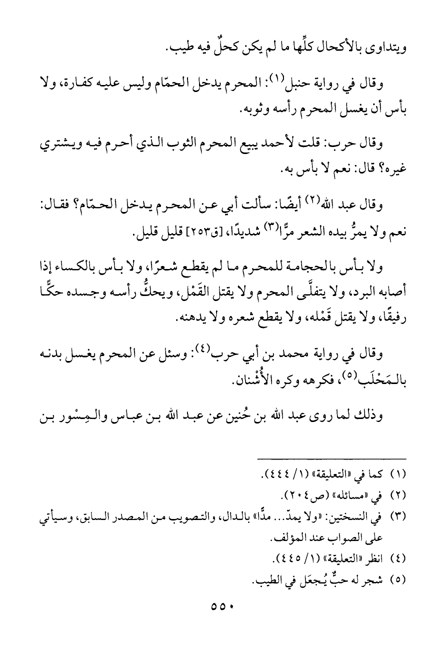 وقال عبد الله (¬٢) أيضًا: سألت أبي عن المحرم يدخل الحمّام؟ فقال: نعم ولا يمرُّ بيده الشعر مرًّا (¬٣) شديدًا، [ق ٢٥٣] قليل قليل.