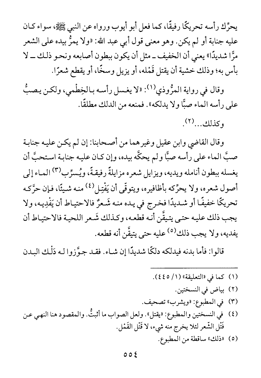 يحرِّك رأسه تحريكًا رفيقًا، كما فعل أبو أيوب ورواه عن النبي - صلى الله عليه وسلم -، سواء كان عليه جنابة أو لم يكن. وهو معنى قول أبي عبد الله: «ولا يمرُّ بيده على الشعر مرًّا شديدًا» يعني أن الخفيف ــ مثل أن يكون ببطون أصابعه ونحو ذلك ــ لا بأس به؛ وذلك خشية أن يقتل قَمْله، أو يزيل وسخًا، أو يقطع شعرًا.