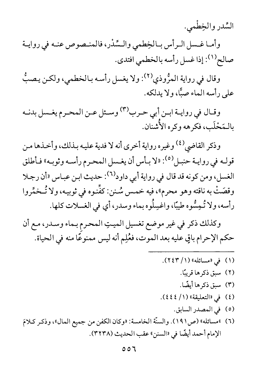 وذكر القاضي (¬٤) وغيره رواية أخرى أنه لا فدية عليه بذلك، وأخذها من قوله في رواية حنبل (¬٥): «لا بأس أن يغسل المحرم رأسه وثوبه» فأطلق الغسل، ومن كونه قد قال في رواية أبي داود (¬٦): حديث ابن عباس «أن رجلا وقصَتْ به ناقته وهو محرم»، فيه خمس سُنن: كفِّنوه في ثوبيه، ولا تُخمِّروا رأسه، ولا تُمِسُّوه طيبًا، واغسِلُوه بماء وسدر، أي في الغسلات كلها.