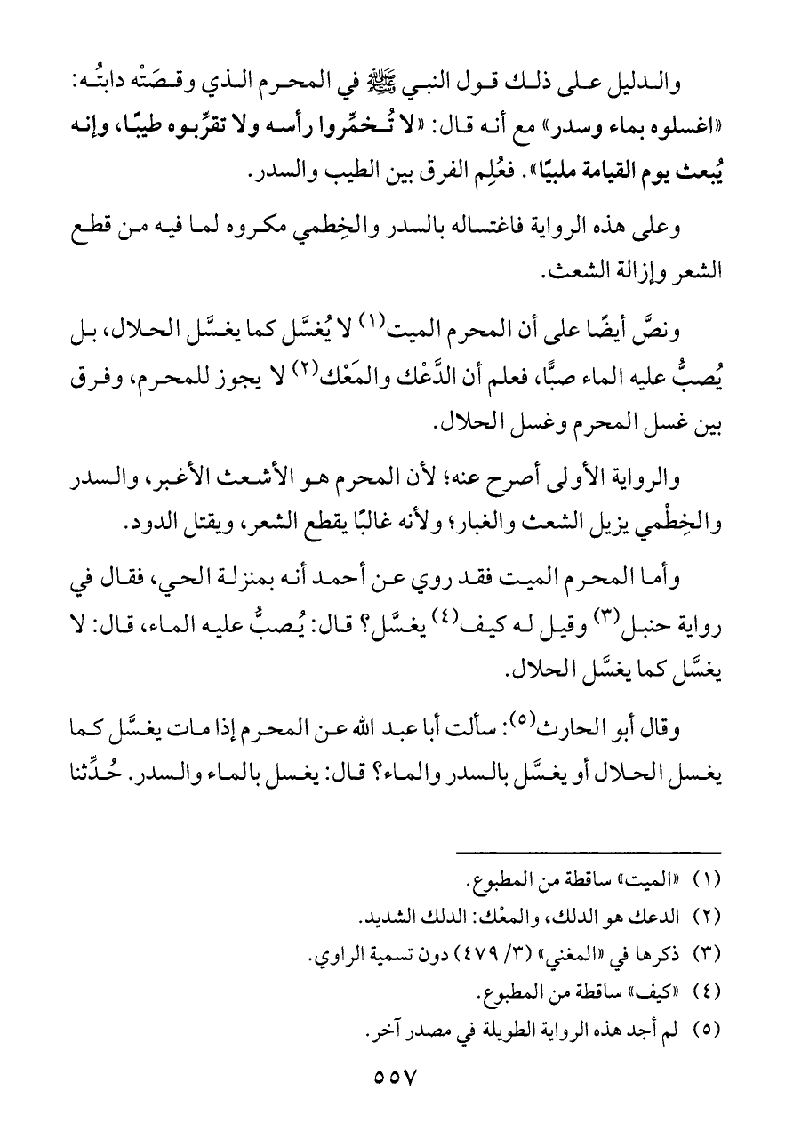 وقال أبو الحارث (¬٥): سألت أبا عبد الله عن المحرم إذا مات يغسَّل كما يغسل الحلال أو يغسَّل بالسدر والماء؟ قال: يغسل بالماء والسدر. حُدِّثنا
