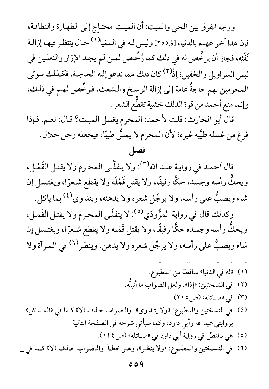 ووجه الفرق بين الحي والميت: أن الميت محتاج إلى الطهارة والنظافة، فإن هذا آخر عهده بالدنيا، [ق ٢٥٥] وليس له في الدنيا (¬١) حال ينتظر فيها إزالة تَفَثِه، فجاز أن يرخَّص له في ذلك كما رُخِّص لمن لم يجد الإزار والنعلين في لبس السراويل والخفين؛ إذْ (¬٢) كان ذلك مما تدعو إليه الحاجة، فكذلك موتى المحرمين بهم حاجةٌ عامة إلى إزالة الوسخ والشعث، فرخِّص لهم في ذلك، وإنما منع أحمد من قوة الدلك خشية تقطُّع الشعر.