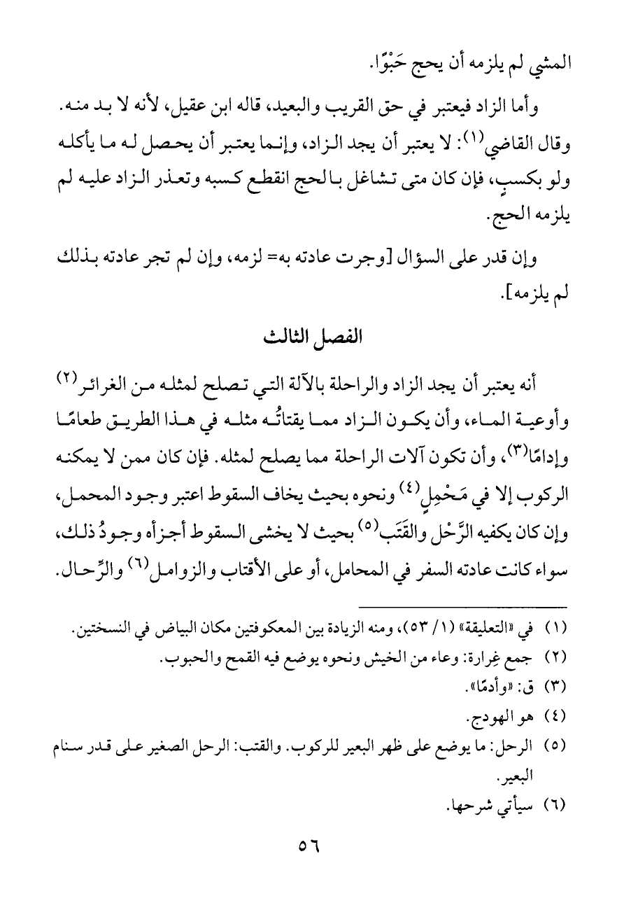 أنه يعتبر أن يجد الزاد والراحلة بالآلة التي تصلح لمثله من الغرائر (¬٢) وأوعية الماء، وأن يكون الزاد مما يقتاتُه مثله في هذا الطريق طعامًا وإدامًا (¬٣)، وأن تكون آلات الراحلة مما يصلح لمثله. فإن كان ممن لا يمكنه الركوب إلا في مَحْمِلٍ (¬٤) ونحوه بحيث يخاف السقوط اعتبر وجود المحمل، وإن كان يكفيه الرَّحْل والقَتَب (¬٥) بحيث لا يخشى السقوط أجزأه وجودُ ذلك، سواء كانت عادته السفر في المحامل، أو على الأقتاب والزوامل (¬٦) والرِّحال.