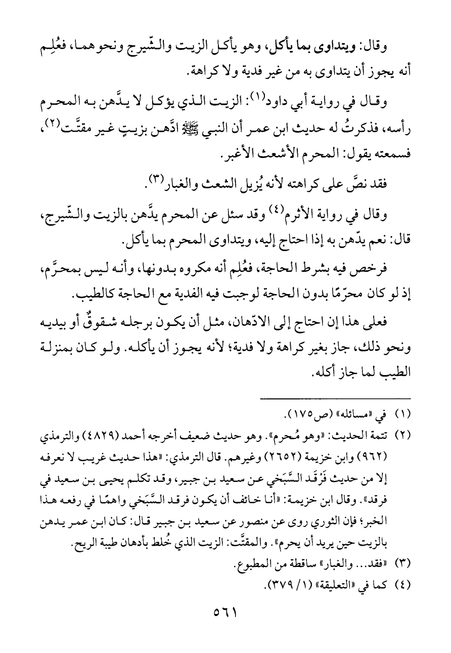 (¬٢) تتمة الحديث: «وهو مُحرم». وهو حديث ضعيف أخرجه أحمد (٤٨٢٩) والترمذي (٩٦٢) وابن خزيمة (٢٦٥٢) وغيرهم. قال الترمذي: «هذا حديث غريب لا نعرفه إلا من حديث فَرْقَد السَّبَخي عن سعيد بن جبير، وقد تكلم يحيى بن سعيد في فرقد». وقال ابن خزيمة: «أنا خائف أن يكون فرقد السَّبَخي واهمًا في رفعه هذا الخبر؛ فإن الثوري روى عن منصور عن سعيد بن جبير قال: كان ابن عمر يدهن بالزيت حين يريد أن يحرم». والمقتَّت: الزيت الذي خُلط بأدهان طيبة الريح.