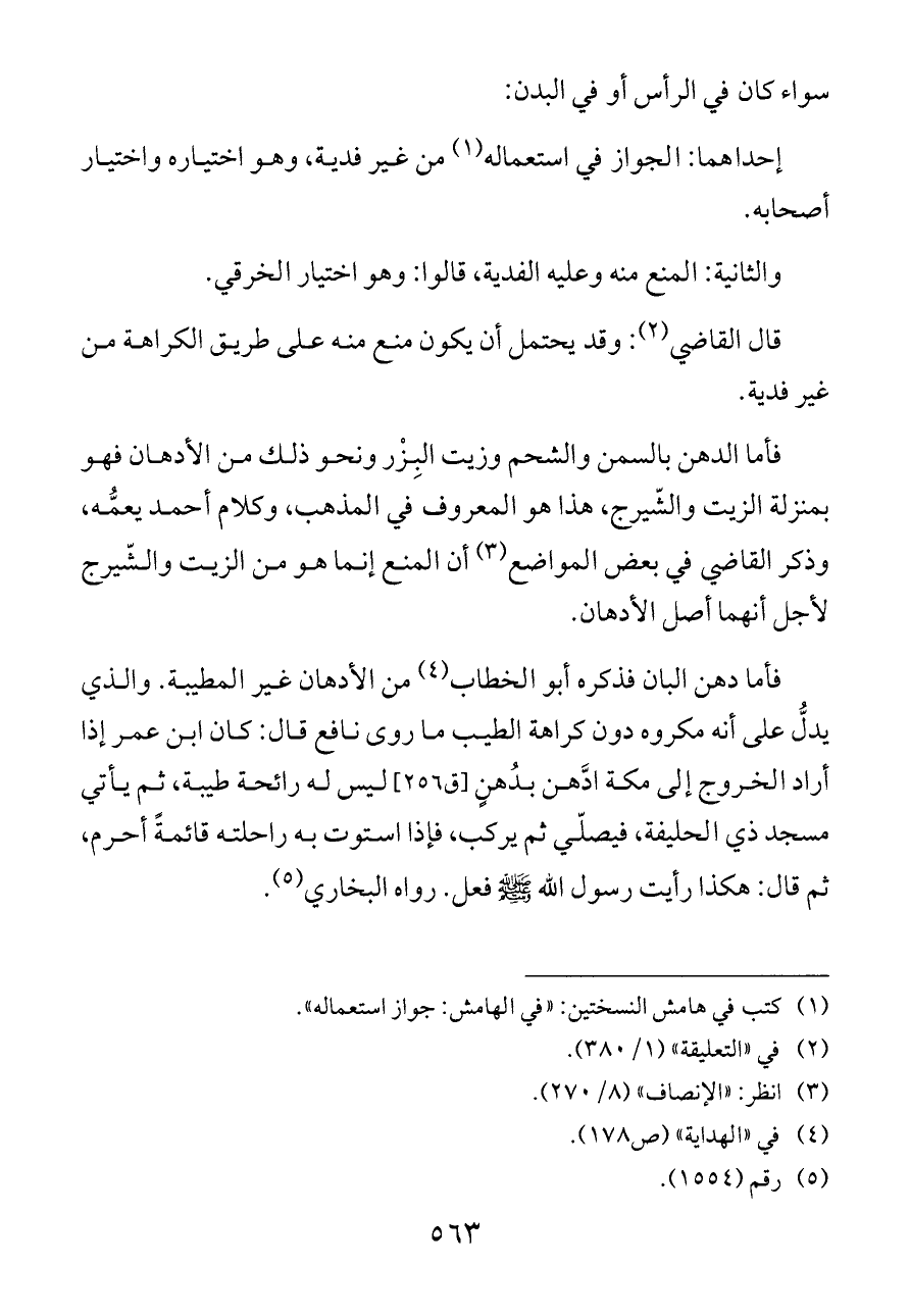 فأما الدهن بالسمن والشحم وزيت البِزْر ونحو ذلك من الأدهان فهو بمنزلة الزيت والشّيرج، هذا هو المعروف في المذهب، وكلام أحمد يعمُّه، وذكر القاضي في بعض المواضع (¬٣) أن المنع إنما هو من الزيت والشّيرج لأجل أنهما أصل الأدهان.