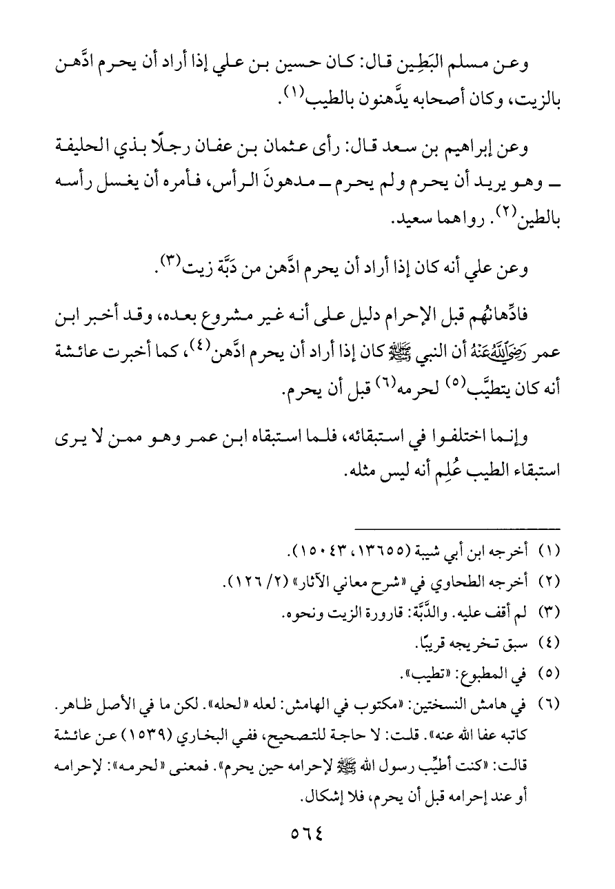 وعن مسلم البَطِين قال: كان حسين بن علي إذا أراد أن يحرم ادَّهن بالزيت، وكان أصحابه يدَّهنون بالطيب (¬١).