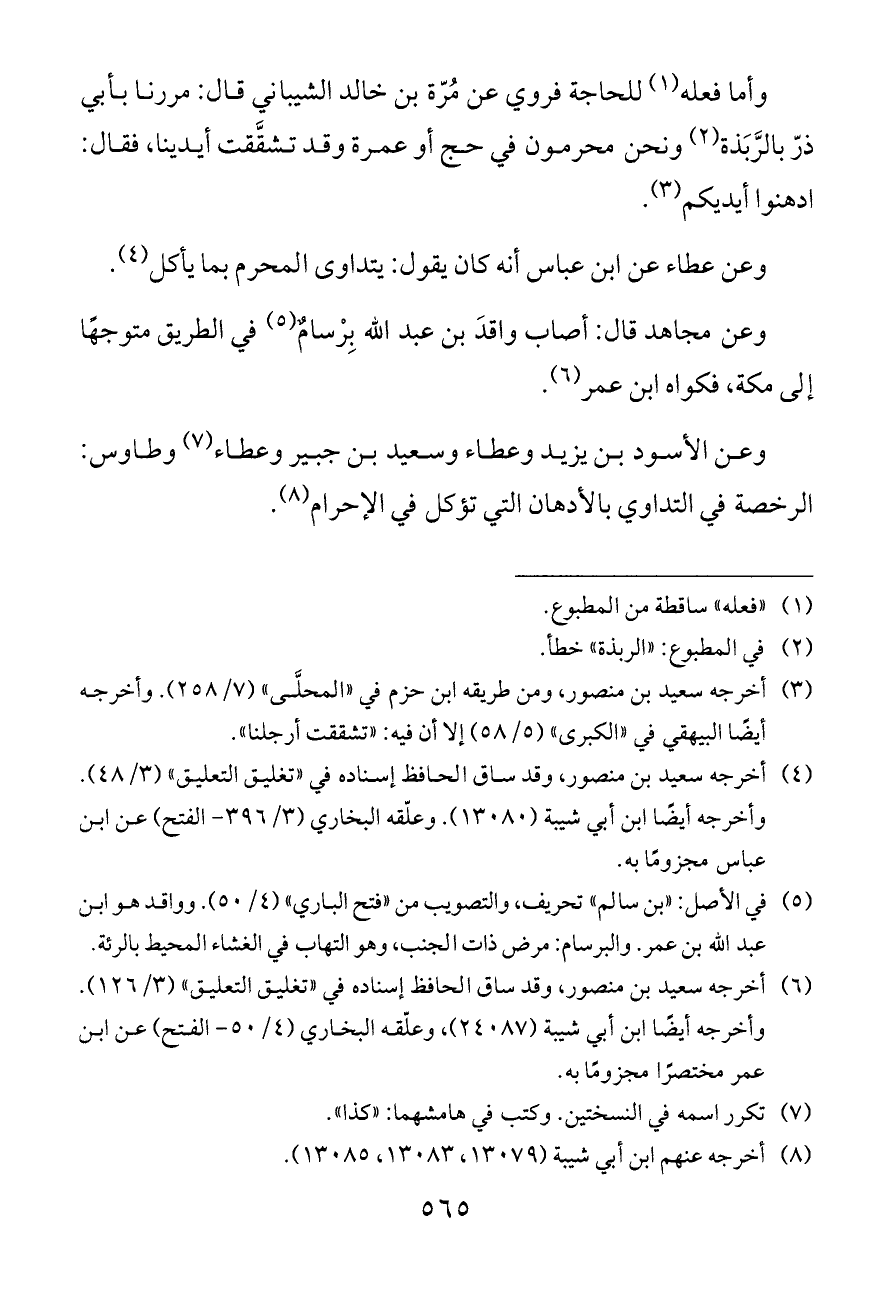 وأما فعله (¬١) للحاجة فروي عن مُرّة بن خالد الشيباني قال: مررنا بأبي ذرّ بالرَّبَذة (¬٢) ونحن محرمون في حج أو عمرة وقد تشقَّقت أيدينا، فقال: ادهنوا أيديكم (¬٣).