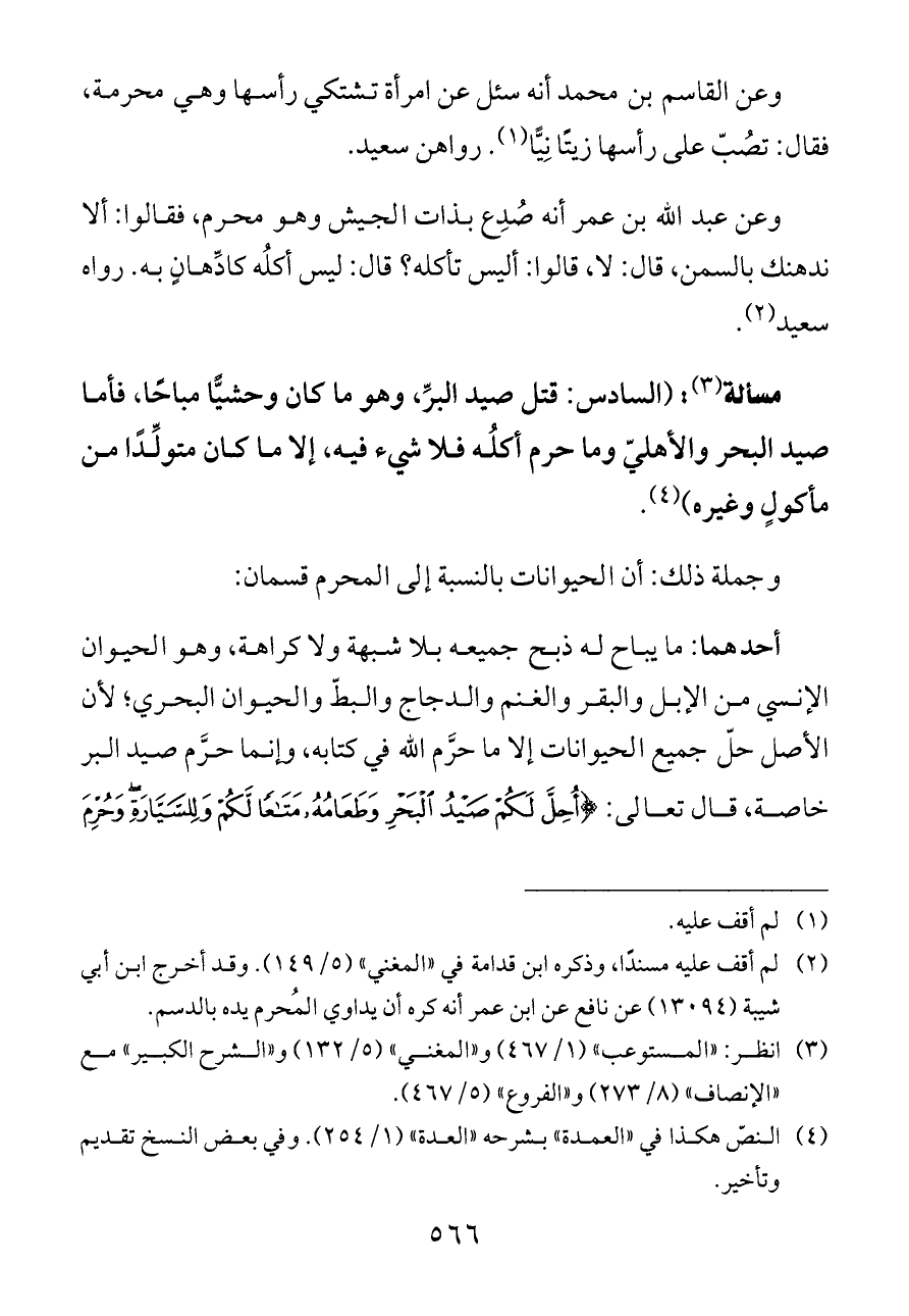 وعن القاسم بن محمد أنه سئل عن امرأة تشتكي رأسها وهي محرمة، فقال: تصُبّ على رأسها زيتًا نِيًّا (¬١). رواهن سعيد.