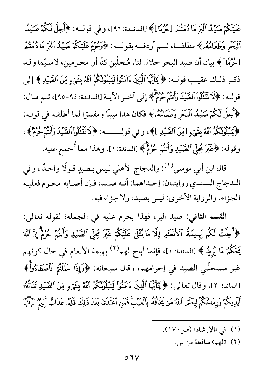 عَلَيْكُمْ صَيْدُ الْبَرِّ مَا دُمْتُمْ [حُرُمًا]} [المائدة: ٩٦]، وفي قوله: {أُحِلَّ لَكُمْ صَيْدُ الْبَحْرِ وَطَعَامُهُ} مطلقا، ثم أردفه بقوله: {وَحُرِّمَ عَلَيْكُمْ صَيْدُ الْبَرِّ مَا دُمْتُمْ [حُرُمًا]} بيان أن صيد البحر حلال لنا، مُحلِّين كنّا أو محرمين، لاسيّما وقد ذكر ذلك عقيب قوله: {يَاأَيُّهَا الَّذِينَ آمَنُوا لَيَبْلُوَنَّكُمُ اللَّهُ بِشَيْءٍ مِنَ الصَّيْدِ} إلى قوله: {لَا تَقْتُلُوا الصَّيْدَ وَأَنْتُمْ حُرُمٌ} إلى آخر الآية [المائدة: ٩٤ - ٩٥]، ثم قال: {أُحِلَّ لَكُمْ صَيْدُ الْبَحْرِ وَطَعَامُهُ} فكان هذا مبينًا ومفسرًا لما أطلقه في قوله: {لَيَبْلُوَنَّكُمُ اللَّهُ بِشَيْءٍ [مِنَ الصَّيْدِ]}، وفي قوله: {لَا تَقْتُلُوا الصَّيْدَ وَأَنْتُمْ حُرُمٌ}، وقوله: {غَيْرَ مُحِلِّي الصَّيْدِ وَأَنْتُمْ حُرُمٌ} [المائدة: ١]. وهذا مما أُجمع عليه.