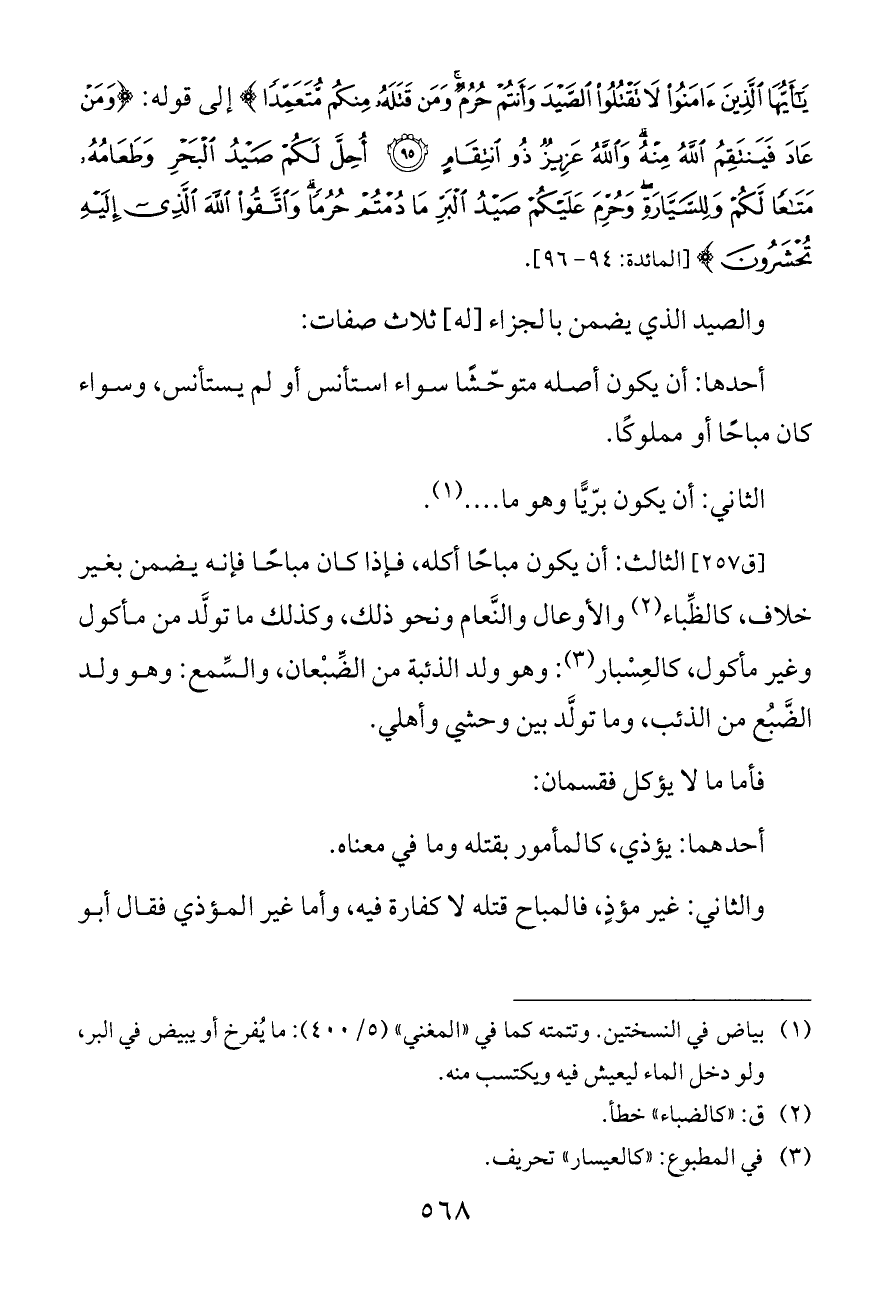 [ق ٢٥٧] الثالث: أن يكون مباحًا أكله، فإذا كان مباحًا فإنه يضمن بغير خلاف، كالظِّباء (¬٢) والأوعال والنَّعام ونحو ذلك، وكذلك ما تولَّد من مأكول وغير مأكول، كالعِسْبار (¬٣): وهو ولد الذئبة من الضِّبْعان، والسِّمع: وهو ولد الضَّبُع من الذئب، وما تولَّد بين وحشي وأهلي.