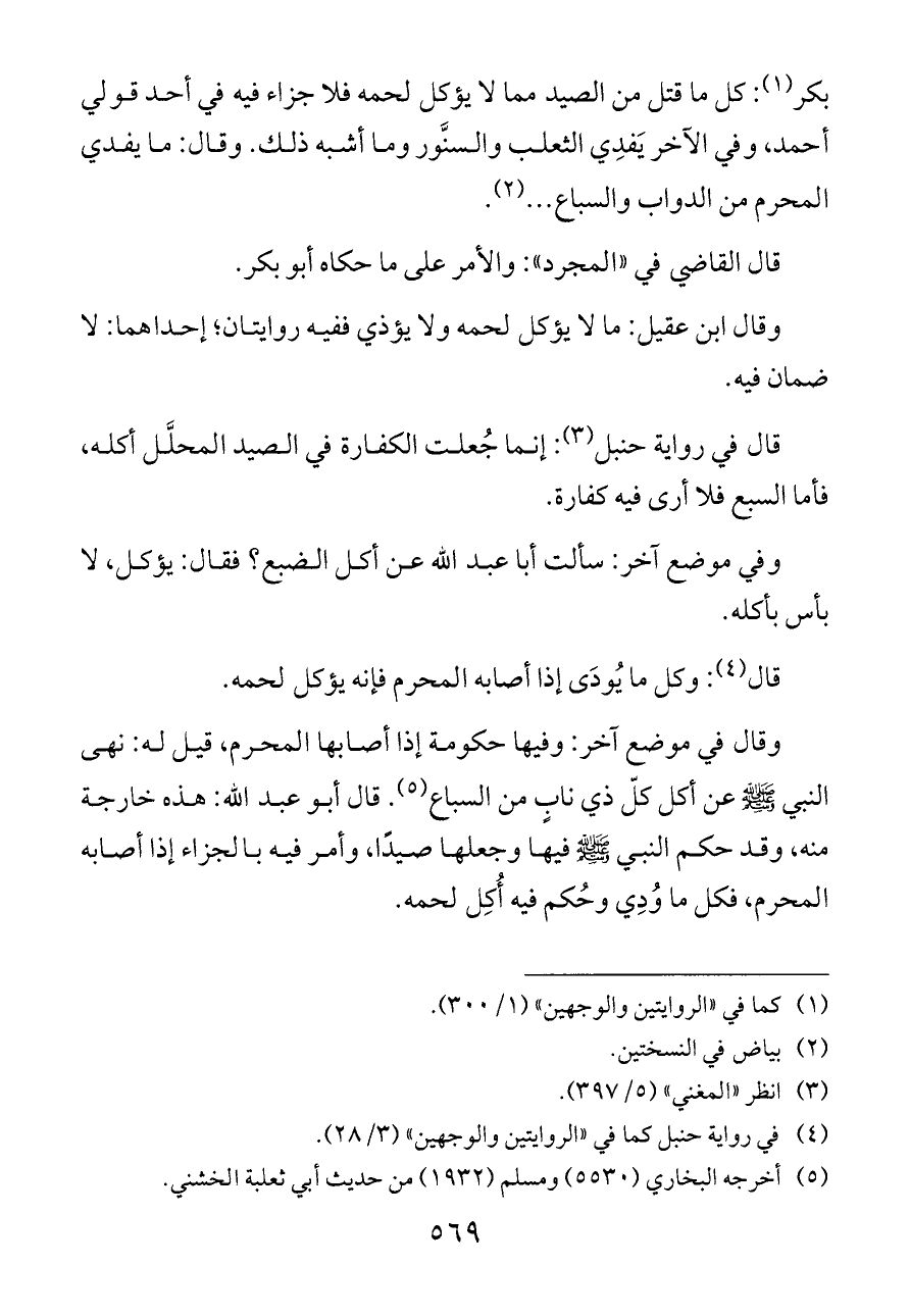 بكر (¬١): كل ما قتل من الصيد مما لا يؤكل لحمه فلا جزاء فيه في أحد قولي أحمد، وفي الآخر يَفدِي الثعلب والسنَّور وما أشبه ذلك. وقال: ما يفدي المحرم من الدواب والسباع ... (¬٢).