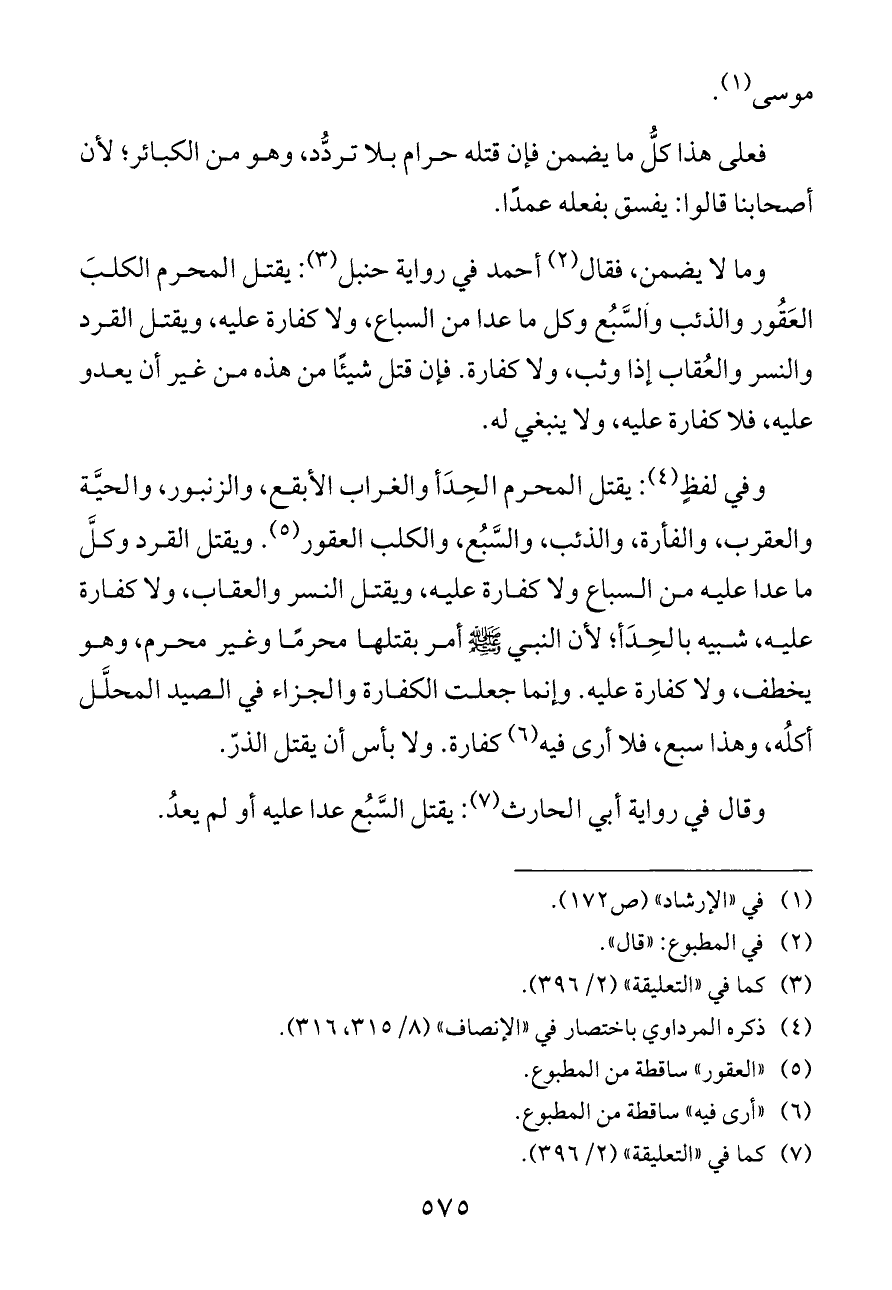 وما لا يضمن، فقال (¬٢) أحمد في رواية حنبل (¬٣): يقتل المحرم الكلبَ العَقُور والذئب والسَّبُع وكل ما عدا من السباع، ولا كفارة عليه، ويقتل القرد والنسر والعُقاب إذا وثب، ولا كفارة. فإن قتل شيئًا من هذه من غير أن يعدو عليه، فلا كفارة عليه، ولا ينبغي له.