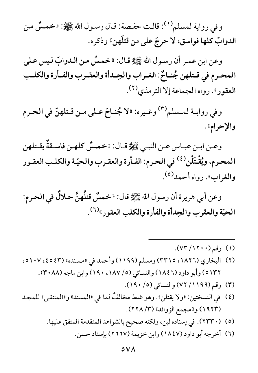 وعن ابن عمر أن رسول الله - صلى الله عليه وسلم - قال: «خمسٌ من الدوابّ ليس على المحرم في قتلهن جُناحٌ: الغراب والحِدأة والعقرب والفأرة والكلب العقور». رواه الجماعة إلا الترمذي (¬٢).