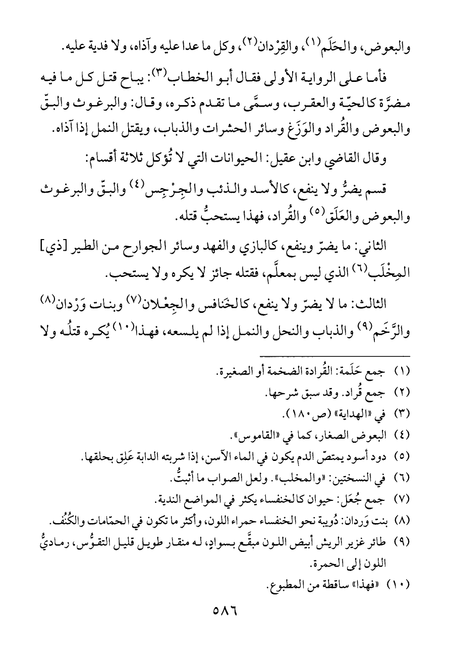 فأما على الرواية الأولى فقال أبو الخطاب (¬٣): يباح قتل كل ما فيه مضرَّة كالحيّة والعقرب، وسمَّى ما تقدم ذكره، وقال: والبرغوث والبقّ والبعوض والقُراد والوَزَغ وسائر الحشرات والذباب، ويقتل النمل إذا آذاه.