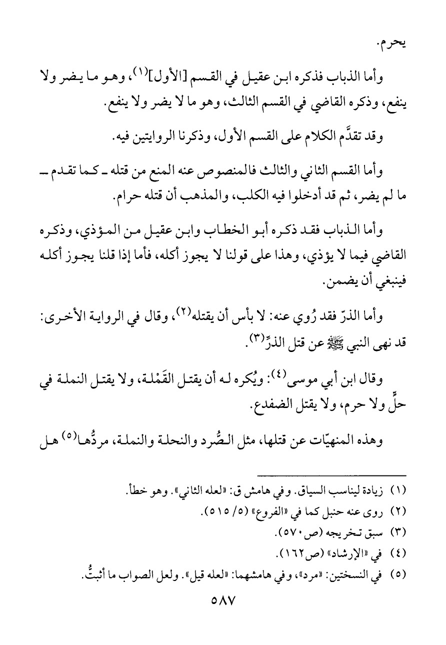 وأما الذباب فذكره ابن عقيل في القسم [الأول] (¬١)، وهو ما يضر ولا ينفع، وذكره القاضي في القسم الثالث، وهو ما لا يضر ولا ينفع.