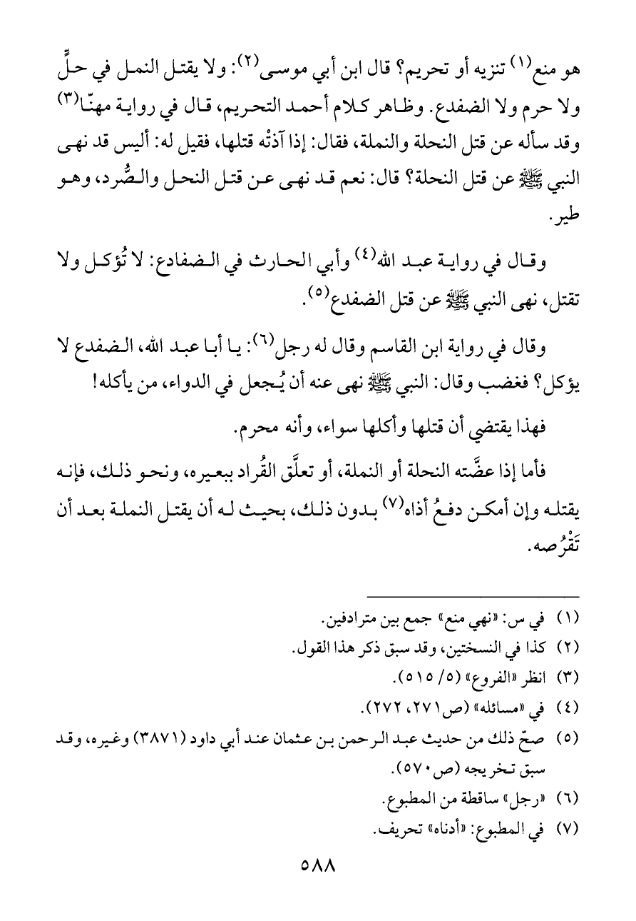 هو منع (¬١) تنزيه أو تحريم؟ قال ابن أبي موسى (¬٢): ولا يقتل النمل في حلٍّ ولا حرم ولا الضفدع. وظاهر كلام أحمد التحريم، قال في رواية مهنّا (¬٣) وقد سأله عن قتل النحلة والنملة، فقال: إذا آذتْه قتلها، فقيل له: أليس قد نهى النبي - صلى الله عليه وسلم - عن قتل النحلة؟ قال: نعم قد نهى عن قتل النحل والصُّرد، وهو طير.
