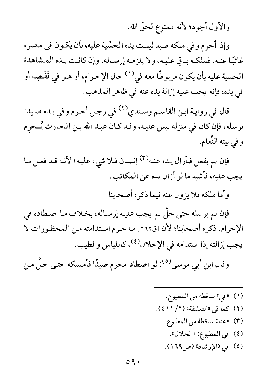 وإذا أحرم وفي ملكه صيد ليست يده الحسِّية عليه، بأن يكون في مصره غائبًا عنه، فملكه باقٍ عليه، ولا يلزمه إرساله. وإن كانت يده المشاهدة الحسية عليه بأن يكون مربوطًا معه في (¬١) حال الإحرام، أو هو في قَفَصِه أو في يده، فإنه يجب عليه إزالة يده عنه في ظاهر المذهب.
