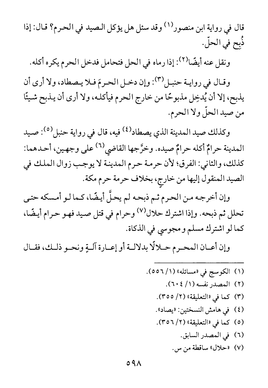 قال في رواية ابن منصور (¬١) وقد سئل هل يؤكل الصيد في الحرم؟ قال: إذا ذُبِح في الحلّ.